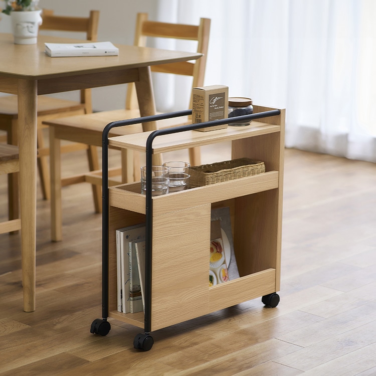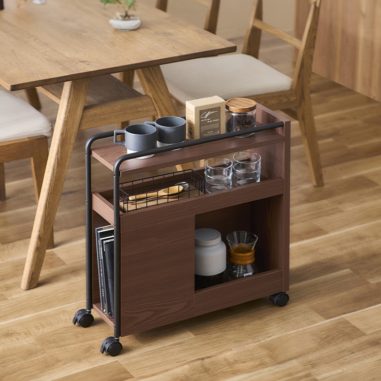 様々なシーンで大活躍するダイニングワゴンです。使い方いろいろ・ダイニングやキッチンで・仕事用の書類や筆記用具の収納・隙間収納にも便利・お子様のお勉強道具・サイドテーブルとしてもごちゃつきがちなダイニングも、このワゴン一台あればすっきり。上段・中段はすぐ使うもの等の収納に。下段はペットボトルなどの高さのあるものも収納できます。側面の窓から取り出しも可能。使わないときはテーブル天板下へ収納可能。★お客様組立★