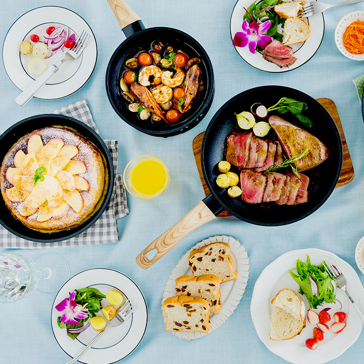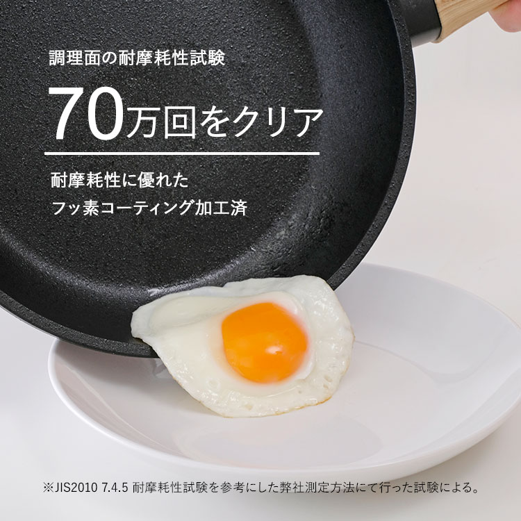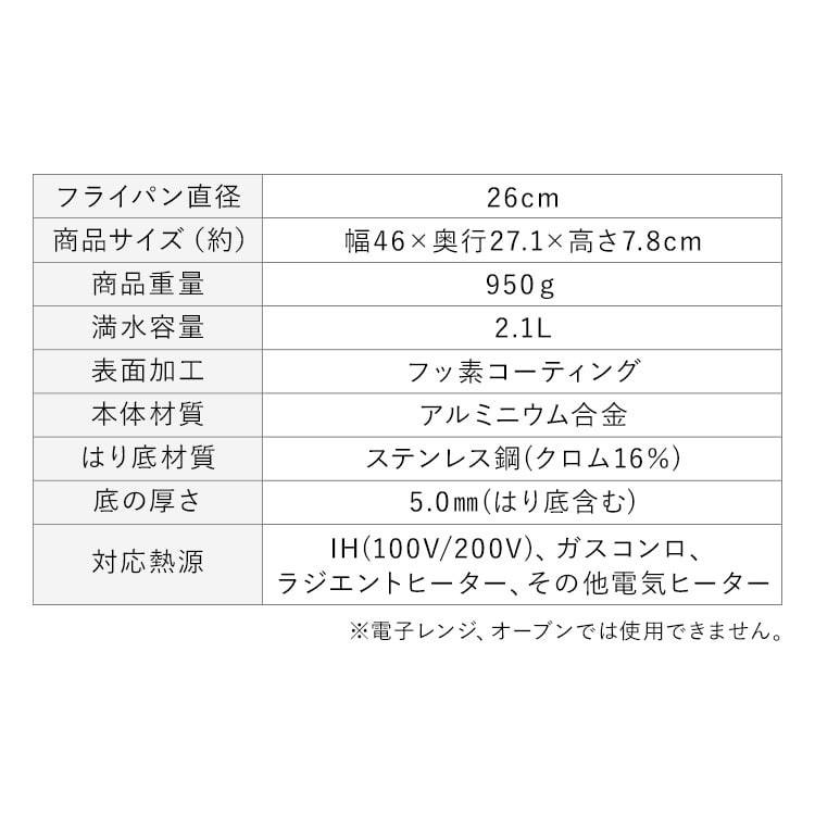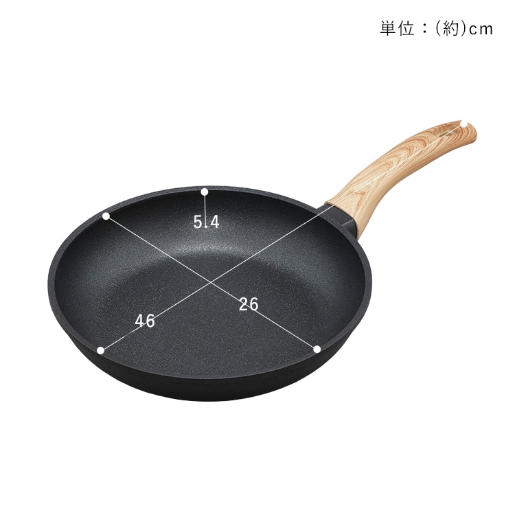 【商品説明】料理がもっと楽しくなるスキレットコートパン。スキレットの良さはそのままに、フライパンと同じような使いやすさです。普段使いはもちろん、おもてなし料理にもおすすめです。■特殊表面コーティングフライパン全体に油がなじみ、ムラのない焼き上がり。熱加減が難しい肉料理もジューシーに。■じっくり、均等に熱が伝わる熱がムラなく行き渡る底厚設計で外はカリッと、中はふっくら仕上がります。■こびりつきにくい調理面の耐摩耗性試験70万回をクリア。耐摩耗性に優れたフッ素コーティング加工済。こびりつきにくく、丈夫で長持ち!■軽量で片手でもラクラク!鉄のスキレットは重くて調理が大変…スキレットコートパンならアルミ製で軽量!■面倒なお手入れが不要アルミ製でさびにくく、面倒なお手入れも不要!フッ素コーティング加工済なので、汚れもスルッと落とせます。【スキレットって?】鉄の特性を生かしたフライパン。熱伝導や蓄熱性に優れ、元々はアウトドア用の調理器具として知られていました。熱伝導の良さと写真映えするデザインで、普段のお料理にも広く使われています。【商品仕様】●商品サイズ(cm)長さ約46×奥行約27.1×高さ約7.8●重量約950g●フライパン直径26cm●表面加工フッ素コーティング(内側/外側)●材質本体:アルミニウム合金ハンドル:フェノール樹脂(耐熱温度150℃)●底の厚さ5.0mm●満水容量2.1L※バーベキューコンロ・炭火でのご利用はご遠慮ください。