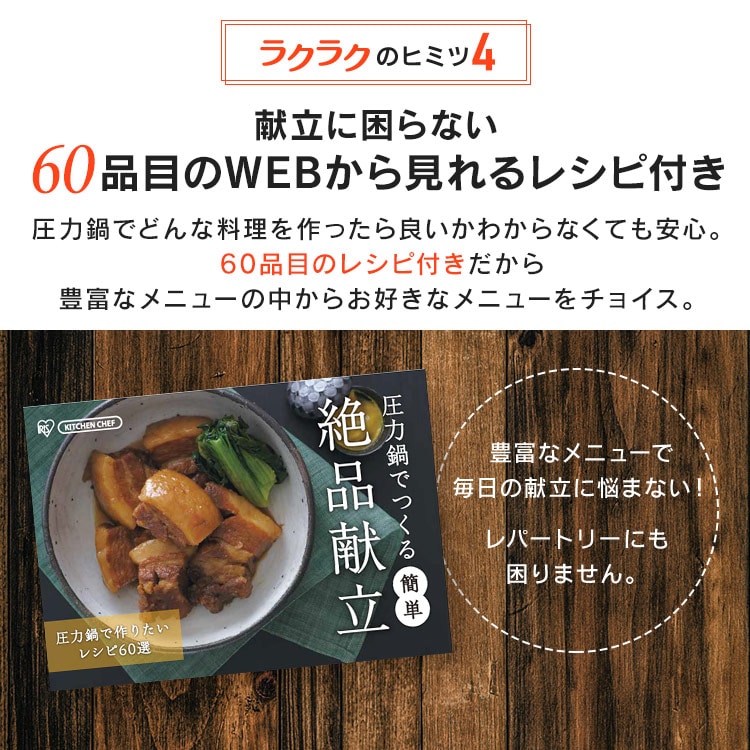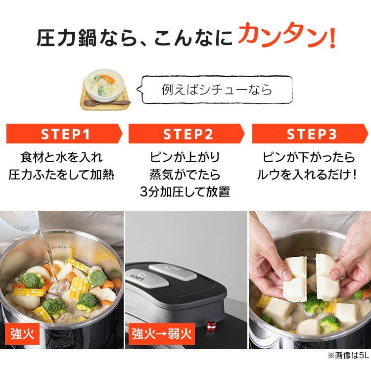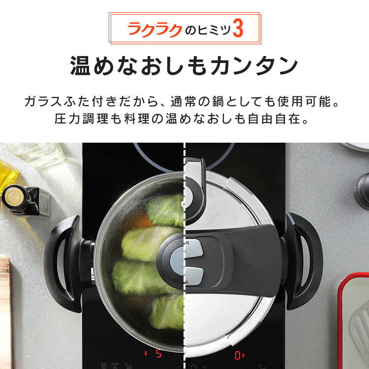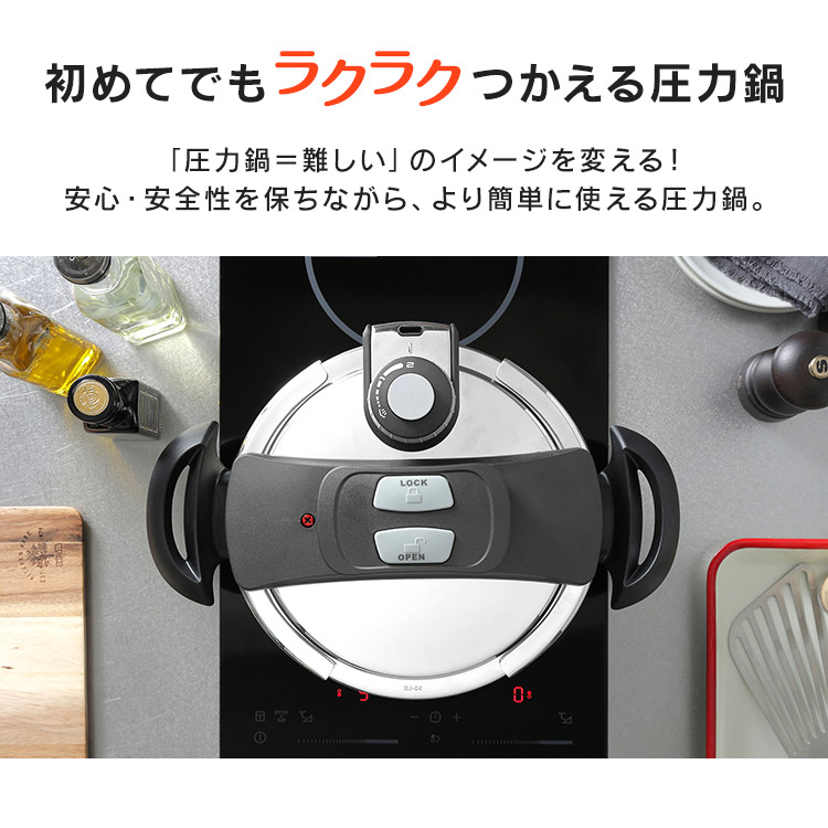 2025年6月4日 商品ページ内画像を一部変更致しました。 2025年5月下旬より商品内容に一部変更がありました。 ■変更内容■ レシピブッグ付き→QRコードから見れるレシピ お届け先が沖縄・離島の場合、お届け日時のご希望に沿えない場合がございます。予めご了承ください。 ■商品サイズ(cm) 幅約37×奥行約23.8×高さ約16 ■容量 3.0L ■材質 本体:ステンレス鋼(クロム18%、ニッケル8%) はり底:ステンレス鋼(クロム16%)、底の厚さ4.5mm(はり底を含む) ■圧力切替 2段階圧力 切り替え式 ■調圧弁 スプリング式 ■セット内容 鍋・圧力蓋・中かご・ガラス蓋・レシピ(QRコード) 「圧力鍋=難しい」のイメージ軽減!ボタンを押すだけのワンタッチ開閉。 料理に合わせて低圧・高圧の切り替えが可能。ダイヤル式でラクラク切り替え。 2段階安全システム構造 【圧力調整装置】 余分な蒸気を排出し、圧力を一定レベルに保ちます。 【ロックピン】 ロックピンの中央の安全弁から圧力を逃がします。 安全ロック構造 【ロックピン】 圧力がかかっている時はロックピンがフタをロック。圧力が下がらないとフタが開きません。 フタが正しく締まっていない場合には一定以上の圧力がかかりません。