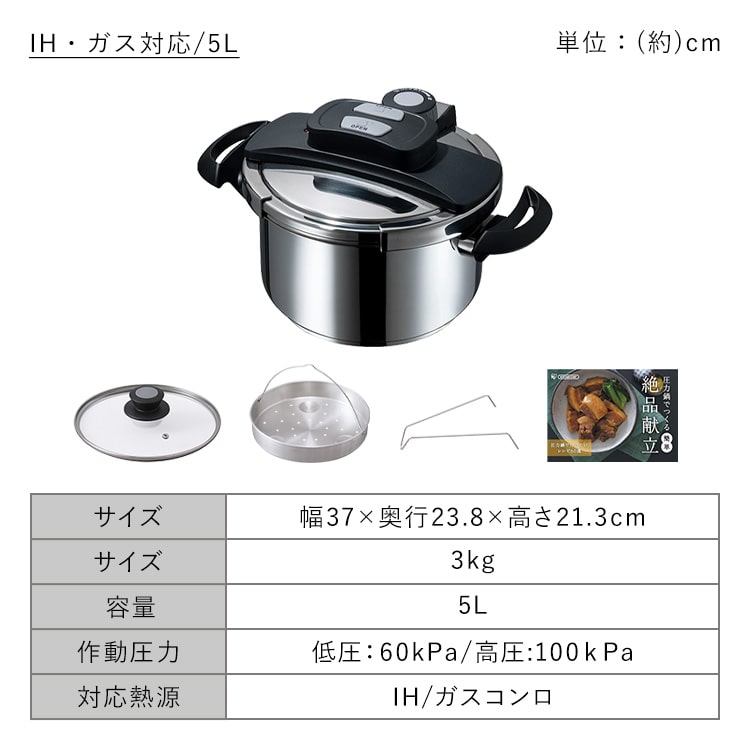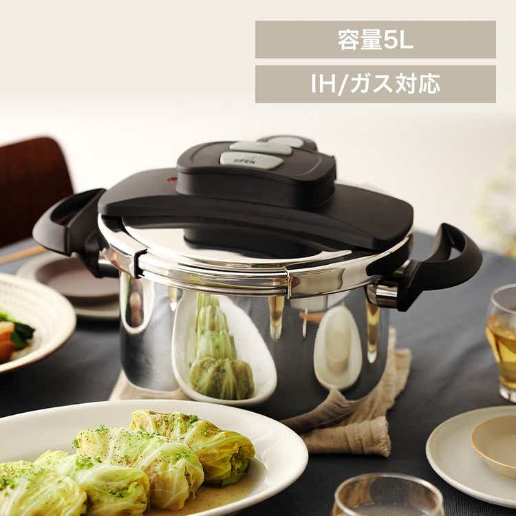 2025年6月4日 商品ページ内画像を一部変更致しました。 2025年5月下旬より商品内容に一部変更がありました。 ■変更内容■ レシピブッグ付き→QRコードから見れるレシピ お届け先が沖縄・離島の場合、お届け日時のご希望に沿えない場合がございます。予めご了承ください。 ■商品サイズ(cm) 幅約37×奥行約23.8×高さ約21.3 ■容量 5.0L ■材質 本体:ステンレス鋼(クロム18%、ニッケル8%) はり底:ステンレス鋼(クロム16%)、底の厚さ4.5mm(はり底を含む) ■圧力切替 2段階圧力 切り替え式 ■調圧弁 スプリング式 ■セット内容 鍋・圧力蓋・中かご・ガラス蓋・レシピブック 「圧力鍋=難しい」のイメージ軽減!ボタンを押すだけのワンタッチ開閉。 料理に合わせて低圧・高圧の切り替えが可能。ダイヤル式でラクラク切り替え。 2段階安全システム構造 【圧力調整装置】 余分な蒸気を排出し、圧力を一定レベルに保ちます。 【ロックピン】 ロックピンの中央の安全弁から圧力を逃がします。 安全ロック構造 【ロックピン】 圧力がかかっている時はロックピンがフタをロック。圧力が下がらないとフタが開きません。 フタが正しく締まっていない場合には一定以上の圧力がかかりません。