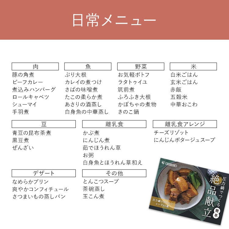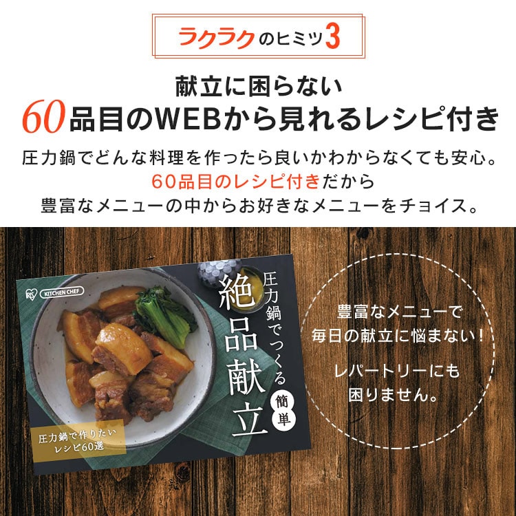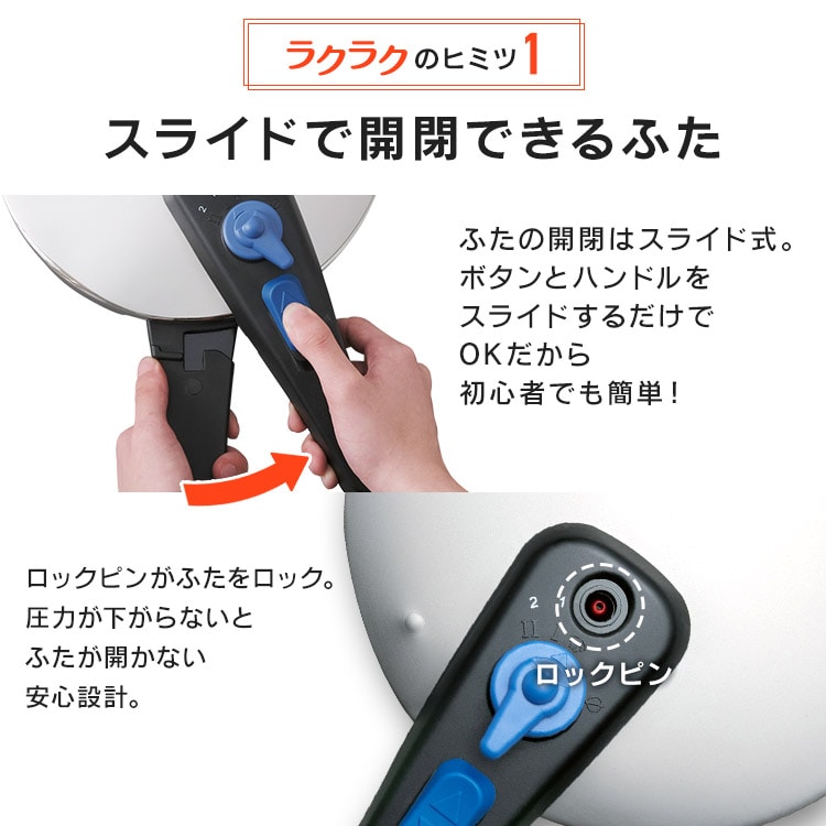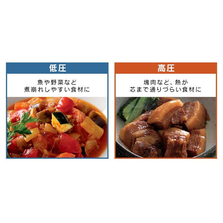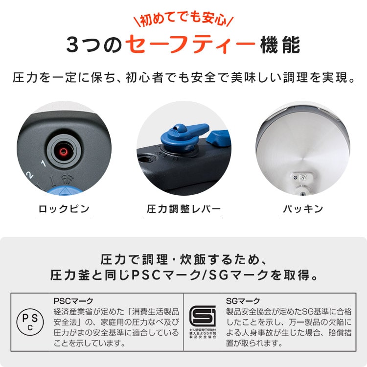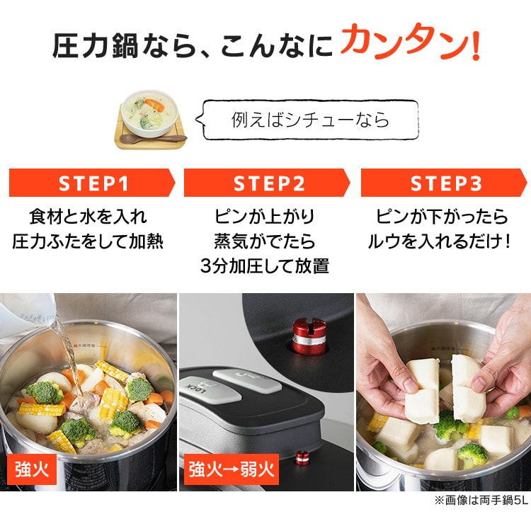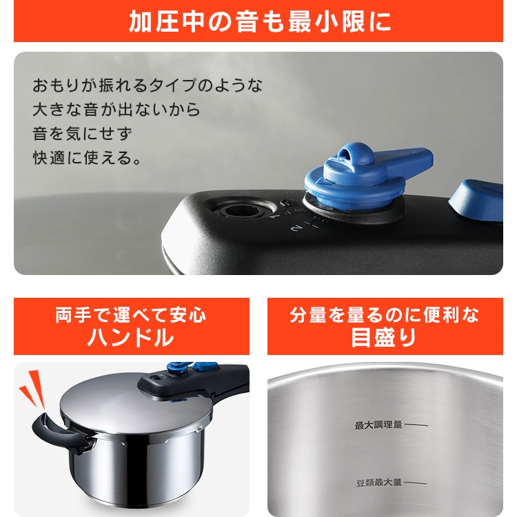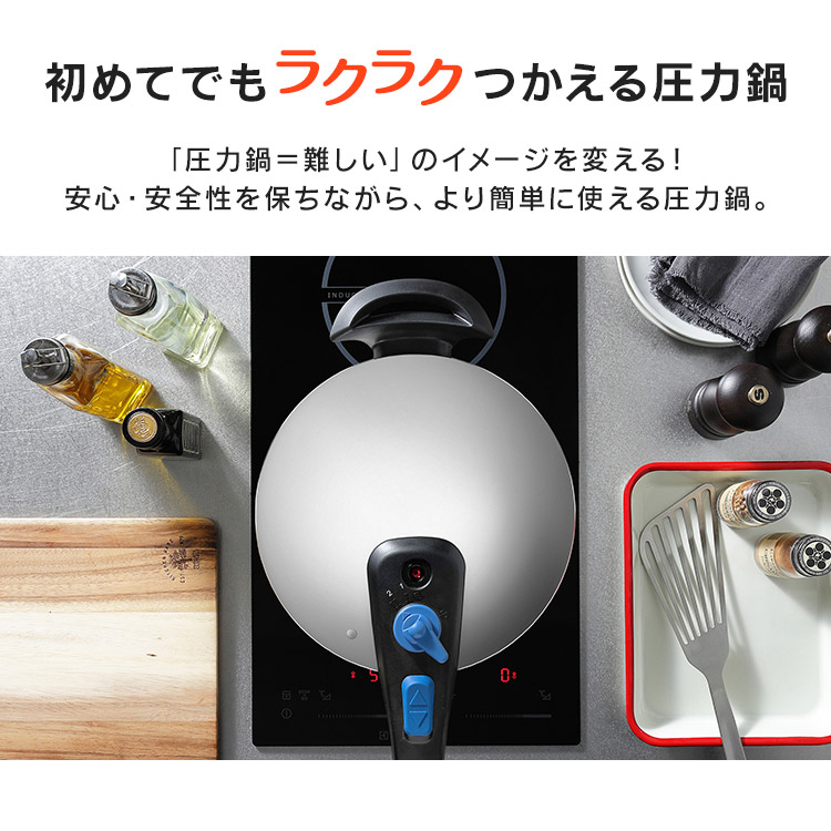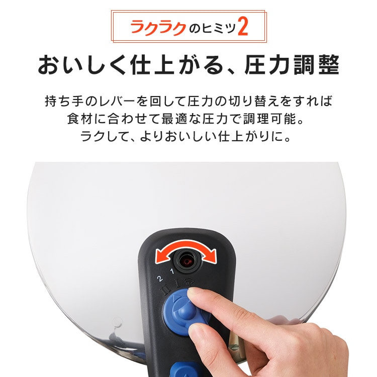 【商品説明】「圧力鍋=難しい」のイメージを変える!操作が簡単で使いやすい圧力鍋です。料理に合わせて低圧・高圧の切り替えが可能。【商品仕様】●商品サイズ(cm)幅約42.3×奥行約21.7×高さ約20.3●製品質量約2.5㎏●満水容量5L●材質本体:ステンレス鋼(クロム18%、ニッケル8%)はり底:ステンレス鋼(クロム16%)、底の厚さ4.5mm(はり底を含む)●圧力切替2段階圧力切り替え式●対応熱源IH・ガス対応
