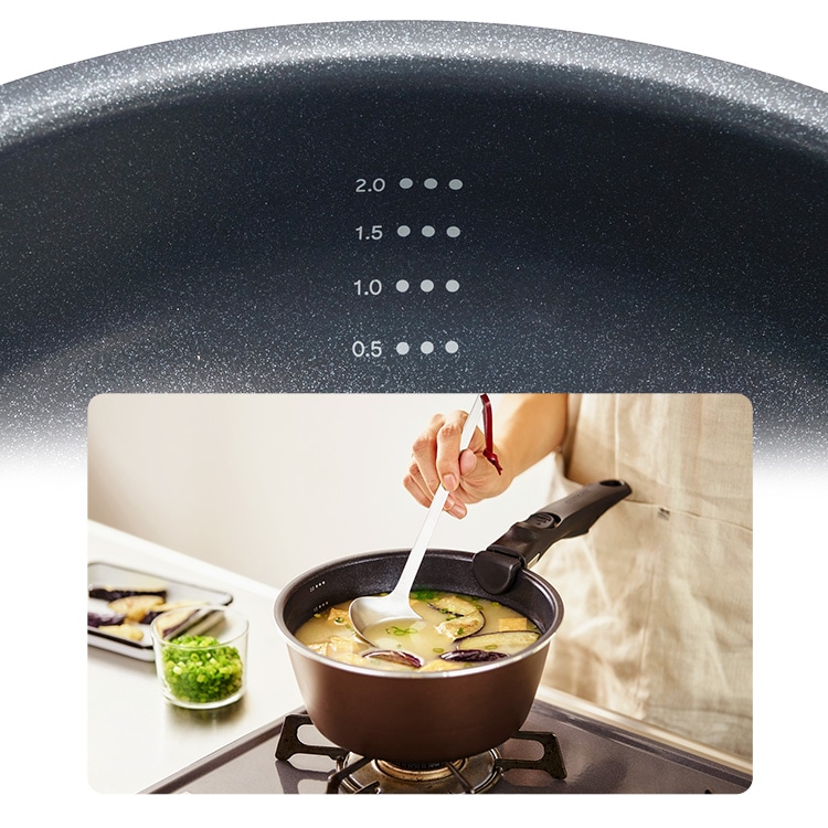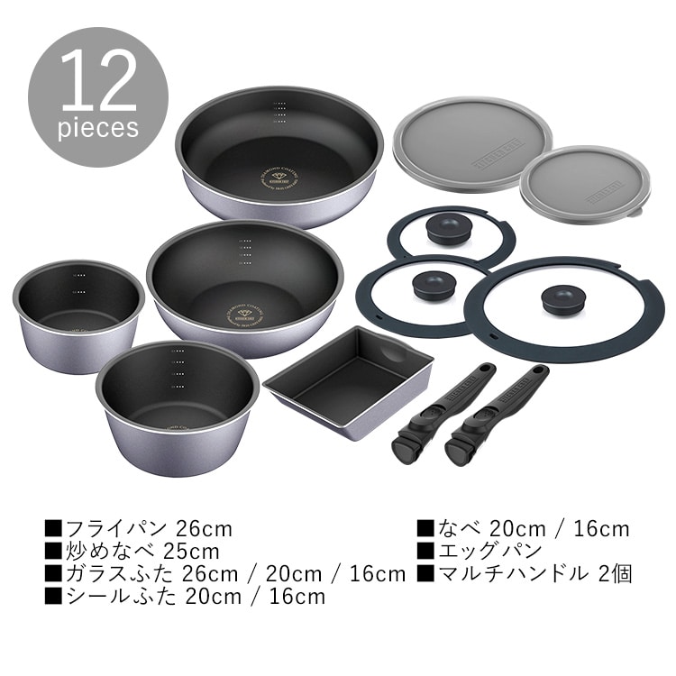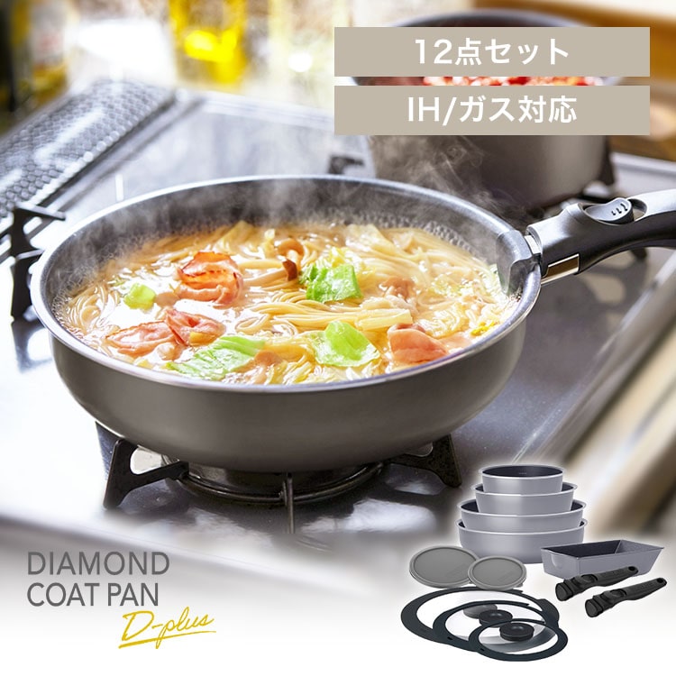 【商品説明】人気のダイヤモンドコートパンに日本の食文化に合わせた深型のシリーズが登場。フライパンは炒め物だけでなく汁物や煮物も作りやすい深さです。鍋とフライパンの内側には目盛りが付いているので、計量カップのように水分量を測れて便利。取っ手を外せば、オーブン調理もできます。※電子レンジでは使用できません。取っ手の取り付けは握るだけ。簡単な操作でセットできます。ガラスふたの持ち手は折りたたみ式で収納がコンパクト。シールふたは鍋ごと冷蔵庫で保管するときに便利。重ねて収納することもできます。【ダイヤモンドコーティングとは】人工ダイヤモンドを細かい粒子状にしてフッ素樹脂コーティングに配合したものです。調理面の耐摩耗性試験を50万回クリア(※)しています。※JIS S 2010 7.4.5耐摩耗性試験を参考にした、アイリスオーヤマ測定法にて行った試験による。※生産時期によっては付属のハンドルのデザインが異なる場合がございます。予めご了承ください。【商品仕様】●セット内容フライパン26cm、炒めなべ25cm、なべ16cm、なべ20cm、エッグパン、ガラスふた16cm、ガラスふた20cm、ガラスふた26cm、シールふた16cm、シールふた20cm、マルチハンドル×2【フライパン】●寸法(cm)フライパン26cm:26●満水容量(約)フライパン26cm:3.3L●材料の種類本体:アルミニウム合金はり底:ステンレス鋼(クロム16%)底の厚さ:4.5mm(はり底を含む)【炒めなべ】●寸法(cm)25●満水容量(約)3.2L●材料の種類本体:アルミニウム合金はり底:ステンレス鋼(クロム16%)底の厚さ:4.5mm(はり底を含む)【なべ】●寸法(cm)なべ16cm:16なべ20cm:20●満水容量(約)なべ16cm:1.4Lなべ20cm:2.4L●材料の種類本体:アルミニウム合金はり底:ステンレス鋼(クロム16%)底の厚さ:4.5mm(はり底を含む)【エッグパン】●寸法(cm)幅約14×奥行約20●満水容量(約)1.1L●材料の種類本体:アルミニウム合金はり底:ステンレス鋼(クロム16%)底の厚さ:4.5mm(はり底を含む)【ガラスふた】●品名強化ガラス製器具●強化の種類全面物理強化●ゴム部シリコーンゴム【PEシールふた】●原料樹脂ポリエチレン●耐熱温度80℃【マルチハンドル】●材質樹脂部:フェノール樹脂、ナイロン金属部:ステンレス鋼(クロム18%、ニッケル8%)ゴム部:シリコーンゴム
