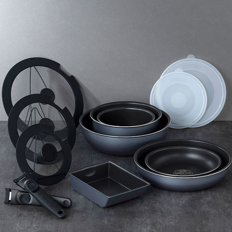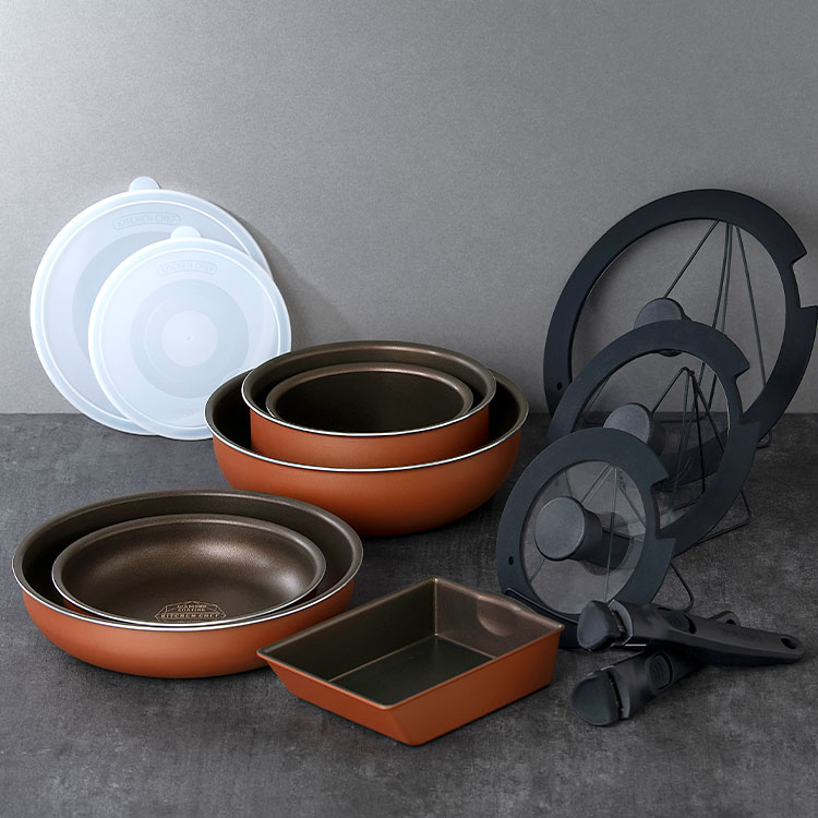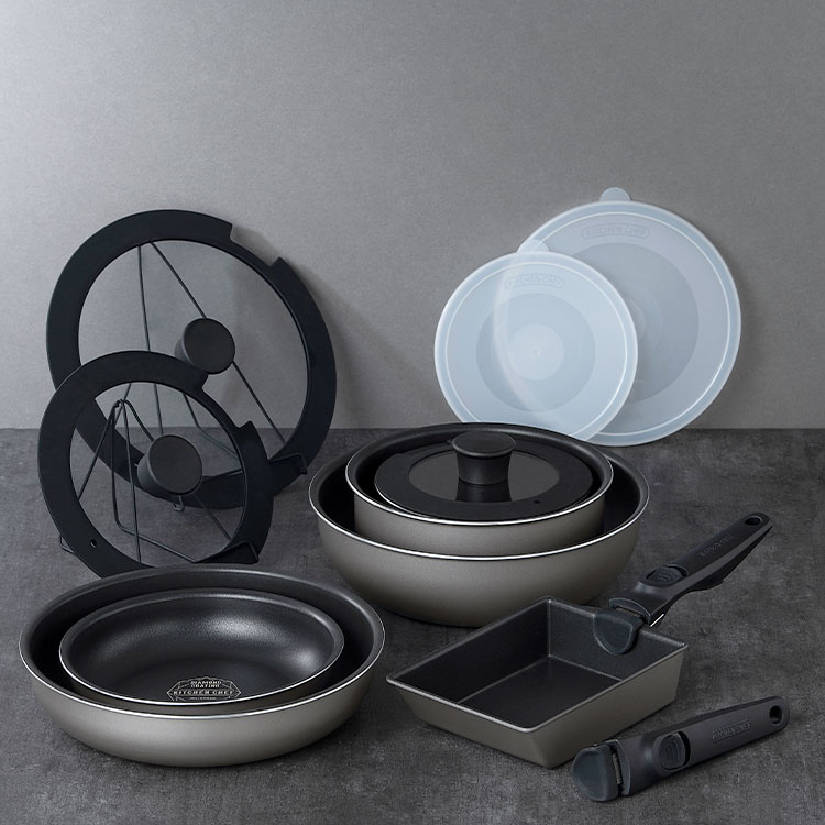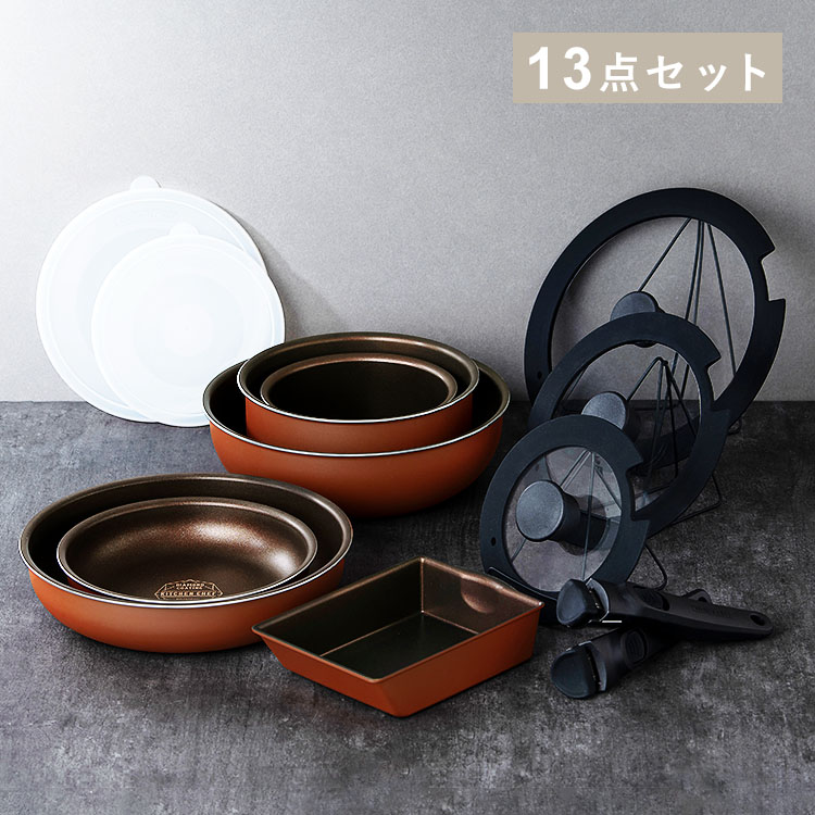 【商品説明】取手が取り外せる着脱式のフライパンです。重ねて収納できます。人工ダイヤモンドを細かい粒子状にして、ふっ素樹脂コーティングに配合した「ダイヤモンドコーティング」仕様。こびりつきを防ぎつつコーティングも長持ちします。※ハンドルは着脱式です。※IH、ガス火両対応です。※電子レンジには使用できません。※食器洗い乾燥機での洗浄、乾燥はしないでください。【商品仕様】【ダイヤモンドコートパン13点セット:PDCI-T13S】●セット内容フライパン20cm、フライパン26cm、炒めなべ26cm、なべ16cm、なべ20cm、エッグパン、シリコーン縁ガラスふた16cm、シリコーン縁ガラスふた20cm、シリコーン縁ガラスふた26cm、PEシールふた16cm、PEシールふた20cm、専用マルチハンドル×2●対応熱源IH対応(IH200V、IH100V)、ガス火、ラジエントヒーター、その他の電気ヒーター※電子レンジ、食洗機では使用できません。【フライパン20cm/26cm】●表面加工(内側/外側)ふっ素樹脂塗膜加工/(底面を除く)焼付け塗装●材料の種類本体:アルミニウム合金はり底:ステンレス鋼(クロム16%)底の厚さ:2.8mm(はり底含む)●寸法20cm/26cm●満水容量1.2L/2.9L【炒めなべ26cm】●表面加工(内側/外側)ふっ素樹脂塗膜加工/(底面を除く)焼付け塗装●材料の種類本体:アルミニウム合金はり底:ステンレス鋼(クロム16%)底の厚さ:2.8mm(はり底含む)●寸法26cm●満水容量3.2L【なべ16cm/20cm】●表面加工(内側/外側)ふっ素樹脂塗膜加工/(底面を除く)焼付け塗装●材料の種類本体:アルミニウム合金はり底:ステンレス鋼(クロム16%)底の厚さ:2.8mm(はり底含む)●寸法16cm/20cm●満水容量1.6L/2.9L【エッグパン】●表面加工(内側/外側)ふっ素樹脂塗膜加工/(底面を除く)焼付け塗装●材料の種類本体:アルミニウム合金はり底:ステンレス鋼(クロム16%)底の厚さ:4.0mm(はり底含む)●寸法約20×14cm●満水容量1.1L【シリコーン縁ガラスふた16cm/20cm/26cm】●品名強化ガラス製器具●強化の種類前面物理強化●ゴム部材質シリコーンゴム●寸法16cm/20cm/26cm【PEシールふた16cm/20cm】●原料樹脂ポリエチレン●耐熱温度80℃●寸法16cm/20cm【専用マルチハンドル】●入り数2本●材質樹脂部:フェノール樹脂、ナイロン金属部:ステンレス鋼(クロム18%、ニッケル8%)ゴム部:シリコーンゴム※必ず中火以下で、調理面には油をひいてご使用ください。※調理後の急激な冷却は避けてください。※金属製の調理器具のため電子レンジではご使用いただけません。※食器洗い乾燥機での洗浄、乾燥はしないでください。