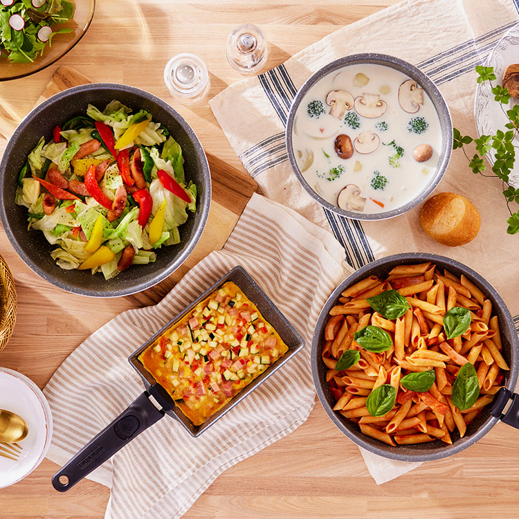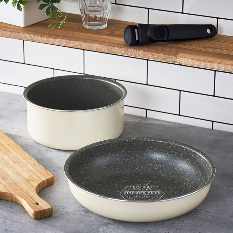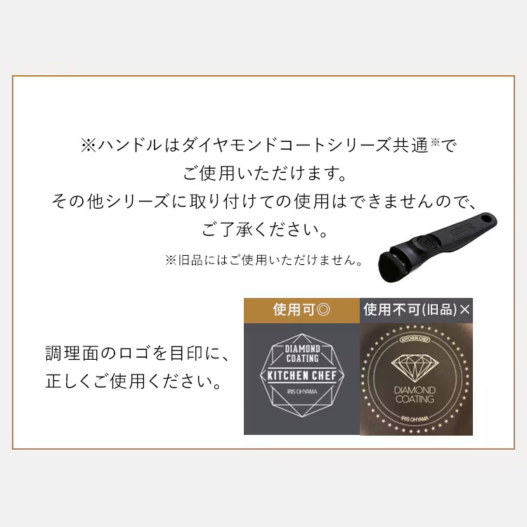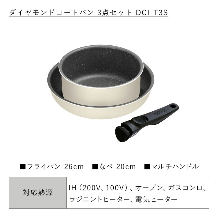 【商品説明】【DIAMOND COAT PAN marbel(ダイヤモンドコートパンマーブル):3点セット】外せる取っ手付き。汚れが付きにくく、お手入れ簡単。IH/ガス火、両対応。◆ダイヤモンドコートパン人工ダイヤモンドを細かい粒子状にして、ふっ素樹脂コーティングに配合。大摩耗性に優れ、アルミへの密着性も高くいためはがれにくく、汚れ等のこびり付きにくさが長持ちします。◆調理面の耐摩耗性試験50万回クリア(※)「するんっ」が続く、快適な使い心地。(※JIS S 2010 試験を参考した測定方法にて行った試験による。)◆外せる取っ手外せてスッキリ収納できるマルチハンドル。取っ手を外したパンはオーブンOK、そのまま冷蔵庫にも。(※急激な冷却は避けてください。)【商品仕様】【ダイヤモンドコートパンマーブル3点セット:DCI-T3S】●セット内容フライパン26cm、なべ20cm、専用マルチハンドル●対応熱源IH対応(IH200V、IH100V)、ガス火、ラジエントヒーター、その他の電気ヒーター※電子レンジ、食洗機では使用できません。【フライパン26cm】●表面加工(内側/外側)ふっ素樹脂塗膜加工/(底面を除く)焼付け塗装●材料の種類本体:アルミニウム合金はり底:ステンレス鋼(クロム16%)底の厚さ:2.8mm(はり底含む)●寸法26cm●満水容量2.9L【なべ20cm】●表面加工(内側/外側)ふっ素樹脂塗膜加工/(底面を除く)焼付け塗装●材料の種類本体:アルミニウム合金はり底:ステンレス鋼(クロム16%)底の厚さ:2.8mm(はり底含む)●寸法20cm●満水容量2.9L【専用マルチハンドル】●材質樹脂部:フェノール樹脂、ナイロン金属部:ステンレス鋼(クロム18%、ニッケル8%)ゴム部:シリコーンゴム※必ず中火以下で、調理面には油をひいてご使用ください。※調理後の急激な冷却は避けてください。※金属製の調理器具のため電子レンジではご使用いただけません。※食器洗い乾燥機での洗浄、乾燥はしないでください。