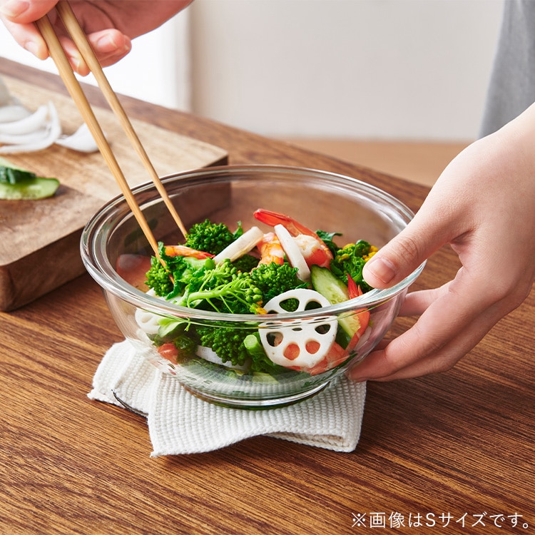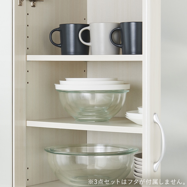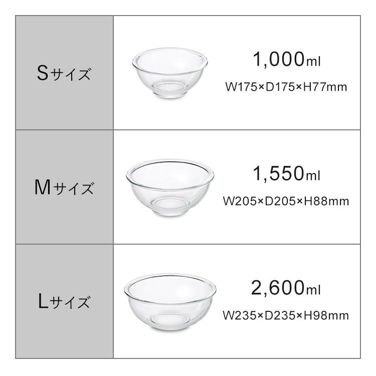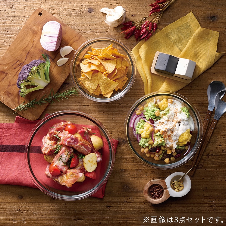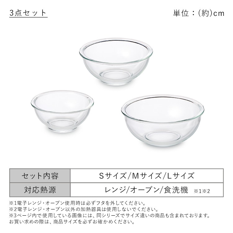 【商品説明】レンジ、オーブン、食洗機対応!色々な料理の調理・保存にも使える耐熱ガラスボウルの3点セットです。調理をしたらそのままテーブルへ。ガラス素材でシンプルなデザイン。見た目が映えるだけでなく、洗い物も減らせます。使わない時はスリムに省スペース収納。重ねると高さがすっきり揃うデザインです。350℃までの加熱調理が可能。電子レンジ・オーブンで使えるから、食材を入れてそのまま加熱OK!ボウルにはフチがあり持ちやすいので調理もスムーズに。ガラス製だからボウルの底まで中の様子が確認できます。ガラス製だから、油落ちが良くラクに洗えます。また、カレーなどを入れてもニオイが残りにくいのでいつでも清潔を保てます。食洗機も使用可能です。(フタは食洗機には入れられません)【商品仕様】●商品サイズ(cm)L:幅約23.5×奥行約23.5×高さ約9.8M:幅約20.5×奥行約20.5×高さ約8.8S:幅約17.5×奥行約17.5×高さ約7.7●材質本体:ホウケイ酸ガラス●セット内容L×1個(フタ無し)M×1個(フタ無し)S×1個(フタ無し)
