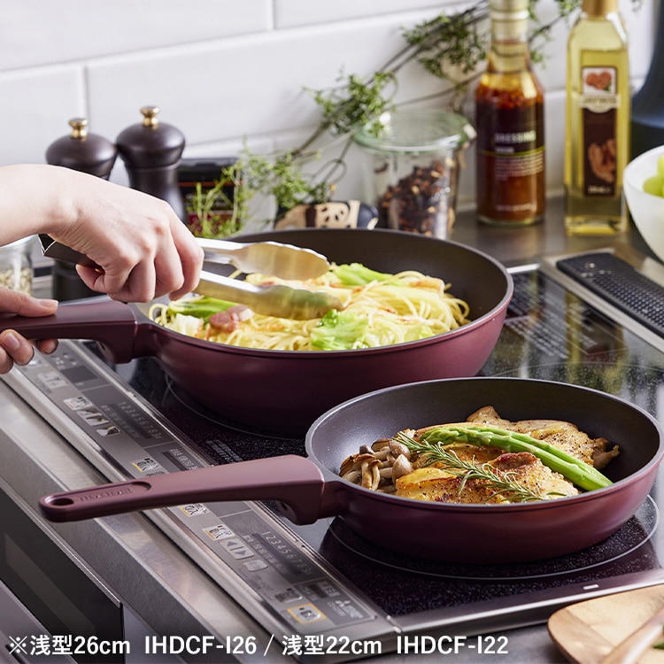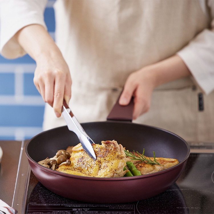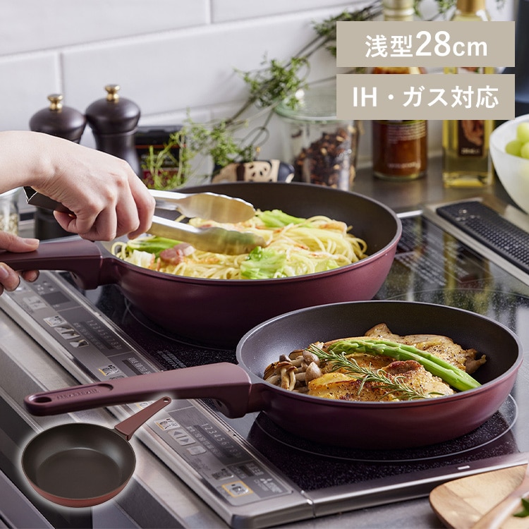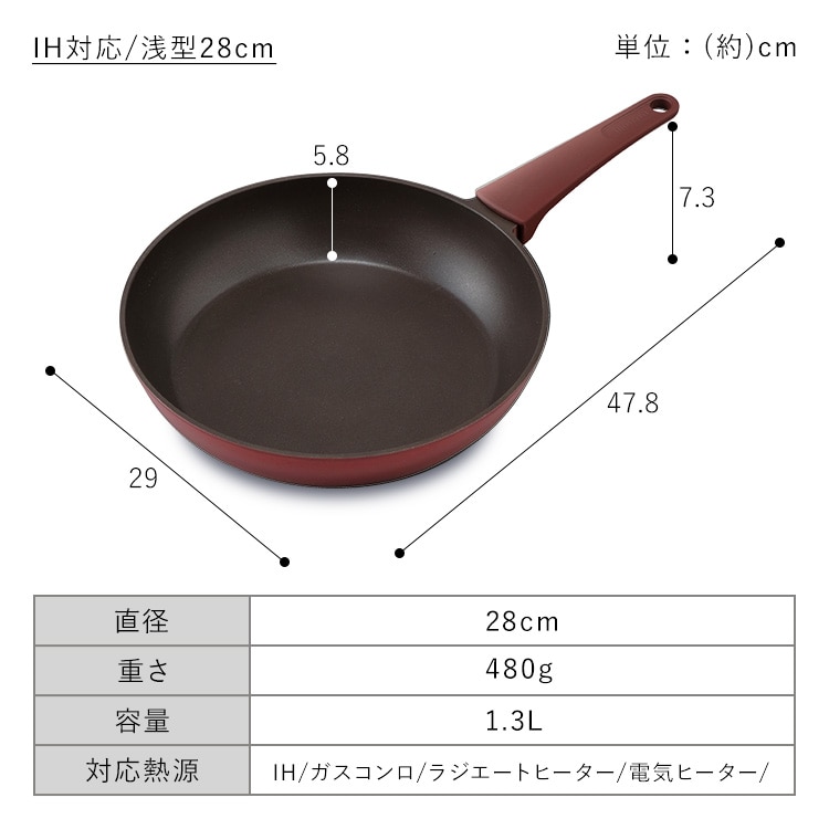 【商品説明】毎日使うものだから、デザインだってこだわりたい。「するっ」と快適な使い心地はそのまま。モダンで都会的なスタイルへ。さっと取ってすぐに使える取っ手一体型。◆シンプルで、機能的凹凸が少なくスマートな形。キッチンになじむシックなカラー。余計なものを省いたら、シンプルで機能的になりました。洗練されたデザインでお料理中の気分も上がる、魅せるフライパン。◆持ちやすくしっかり握れるハンドルハンドルにはシリコンコーティングを採用し、グリップ力をUP。しっかり握れて調理がしやすい仕様に。つるんと凹みがないので、握っても痛くありません。◆熱伝導が良く、ムラなく焼ける短時間でしっかり具材に熱が行き渡る、熱伝導の良さも魅力。ムラなく焼けるから見た目&おいしさアップ。◆ダイヤモンドコーティングはここが違う食材がくっつきにくく、するっと盛れる。少ない油でもこびりつかずに調理できてヘルシー。◆お手入れしやすい設計汚れがするっと落ちるから洗い物も簡単。内側にネジが無いのでスポンジが引っ掛からず、汚れも溜まりにくくなっています。IH、ガスコンロ、ラジエントヒーター、その他の電気ヒーター対応。※電子レンジ、オーブンでは使用できません。【商品仕様】●商品サイズ(cm)幅約29×奥行約47.8×高さ約7.3●質量約780g●寸法28cm●満水容量約3.1L●表面加工内側:ふっ素樹脂塗膜加工外側:(底面を除く)焼付け塗装●材質の種類本体:アルミニウム合金ハンドル:フェノール樹脂はり底:ステンレス鋼(クロム16%)底の厚さ:3mm