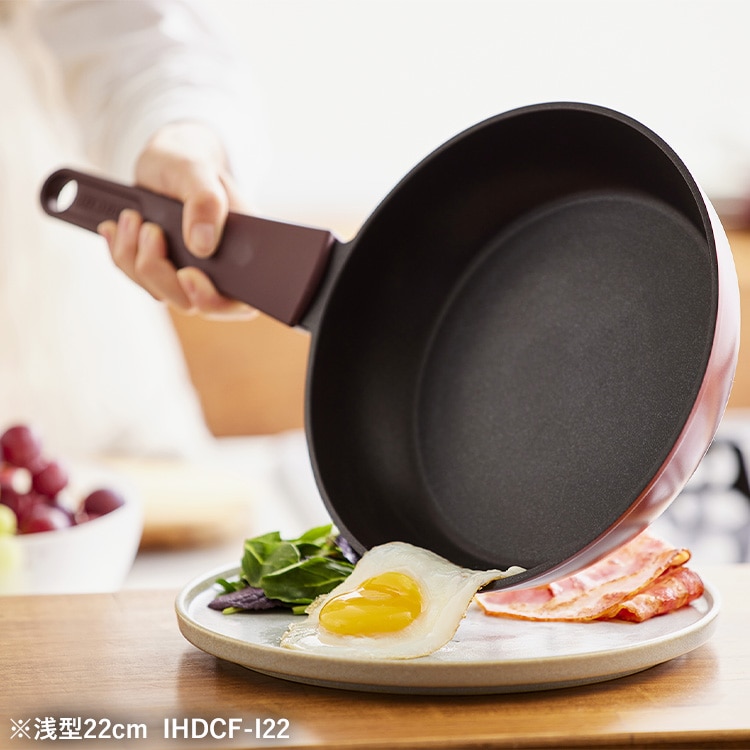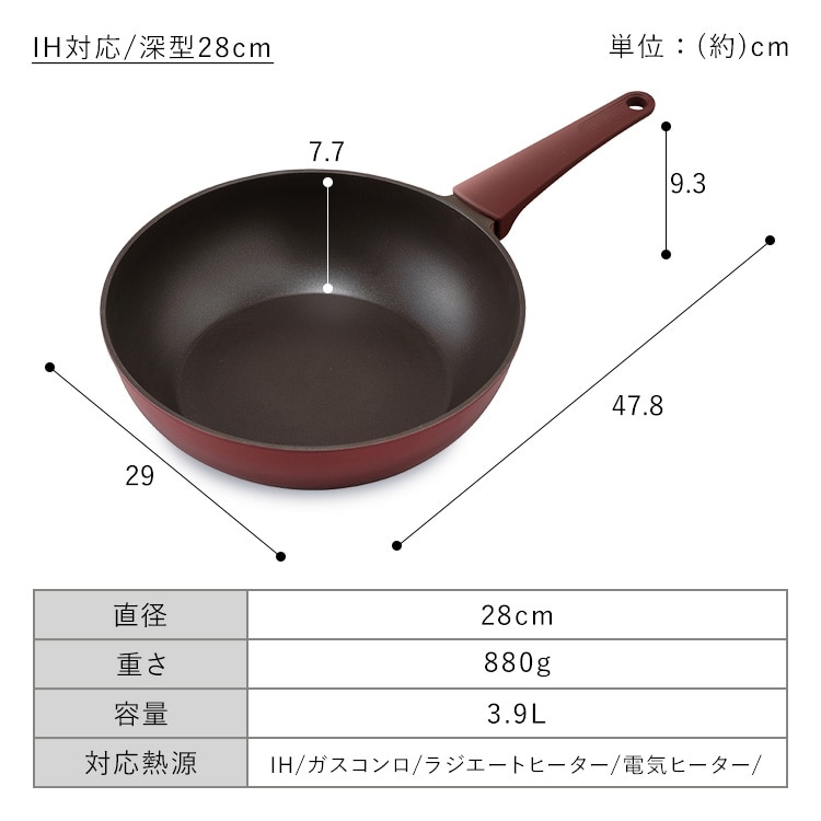 【商品説明】毎日使うものだから、デザインだってこだわりたい。「するっ」と快適な使い心地はそのまま。モダンで都会的なスタイルへ。さっと取ってすぐに使える取っ手一体型。◆シンプルで、機能的凹凸が少なくスマートな形。キッチンになじむシックなカラー。余計なものを省いたら、シンプルで機能的になりました。洗練されたデザインでお料理中の気分も上がる、魅せるフライパン。◆炒め物にぴったりな深型深さがあり食材がこぼれにくい設計で、チャーハンや野菜炒めなどもお手の物。プロの料理人の気分で調理が楽しめます。◆持ちやすくしっかり握れるハンドルハンドルにはシリコンコーティングを採用し、グリップ力をUP。滑りにくくしっかり握れるから調理がしやすい。◆熱伝導が良く、ムラなく焼ける短時間でしっかり具材に熱が行き渡る、熱伝導の良さも魅力。ムラなく焼けるから見た目&おいしさアップ。◆丈夫で使いやすいダイヤモンドコーティングフッ素加工樹脂に人工ダイヤモンドの細かな粒子を配合することで、耐摩耗性をアップ。コーティングの耐久性が高く傷にも強い。◆お手入れしやすい設計汚れがするっと落ちるから洗い物も簡単。内側にネジが無いのでスポンジが引っ掛からず、汚れも溜まりにくくなっています。IH、ガスコンロ、ラジエントヒーター、その他の電気ヒーター対応。※電子レンジ、オーブンでは使用できません。【商品仕様】●商品サイズ(cm)幅約29×奥行約47.8×高さ約9.3●質量約880g●寸法28cm●満水容量約3.9L●表面加工内側:ふっ素樹脂塗膜加工外側:(底面を除く)焼付け塗装●材質の種類本体:アルミニウム合金ハンドル:フェノール樹脂はり底:ステンレス鋼(クロム16%)底の厚さ:3mm