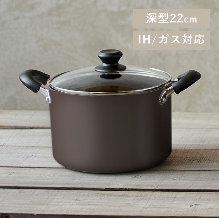 【商品説明】ダイヤモンドコート両手なべ、22cm深型/IH・ガス対応。【日常に寄り添う、使いやすい鍋】カレーやスープなど、3~4人分の調理にぴったり。ほどよい深さのある形が麺類をゆでる時にも便利です。(スープ約4人分)【ダイヤモンドコーティングで、こびりつきにくい】丈夫で長持ち!!耐摩耗性試験約“50万回(※)”クリア。(※JIS S 2010 7.4.5耐摩耗性試験を参考にした、弊社測定不法にて行った試験より。)人工ダイヤモンドを細かい粒子にして、フッ素加工樹脂に配合。摩耗に強く、コーティングが剥がれにくいから、ソースやスープはするっとキレイに注げます。汚れもするっと落ちるので、洗い物が簡単に。洗剤の量も少なく、エコ&経済的。落ち着いた色合いで、キッチンに置いた時もスタイリッシュに。毎日のお料理をもっと楽しく。【商品仕様】●商品サイズ(cm)幅約34.5×奥行約22.5×高さ約17(なべ本体)●質量約1.5kg(ガラスふた含む)●寸法(cm)なべ:直径約22なべ深さ:15.5ガラスふた:直径約22●満水容量約5.5L●対応熱源IH200V、IH100V、ガス火、ラジエントヒーター、その他の電気ヒーター(※電子レンジ、オーブンでは使用できません。)●セット内容両手なべ深型22cm、ガラスふた22cm●品質表示【両手なべ深型22cm】表面加工(内側/外側):ふっ素樹脂塗膜加工/(底面を除く)焼付け塗装本体:アルミニウム合金ハンドル:アルミニウム合金、フェノール樹脂はり底:ステンレス鋼(クロム16%)底の厚さ:2.6mm(はり底含む)【ガラスふた】品名:強化ガラス製器具強化の種類:全面物理強化金属部:ステンレス鋼(クロム16%)樹脂部:フェノール樹脂●カラーホワイト、ブラック、ブラウン