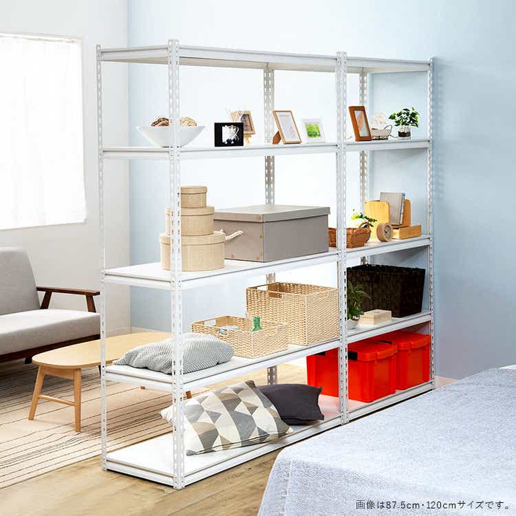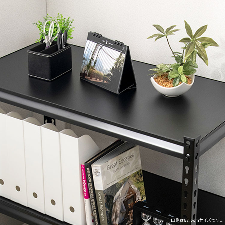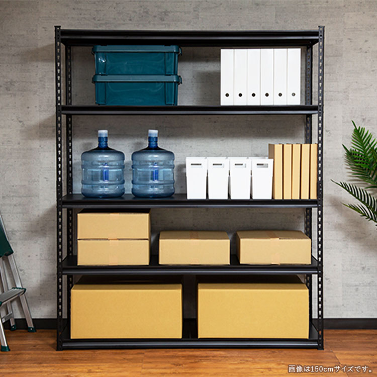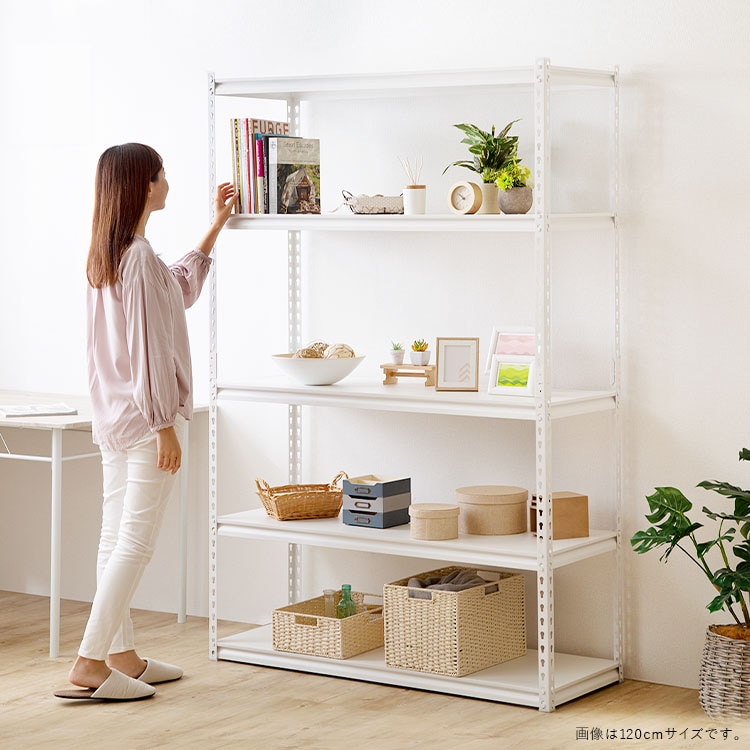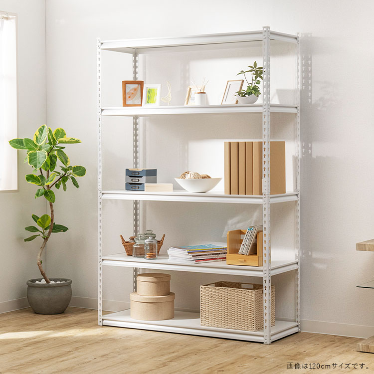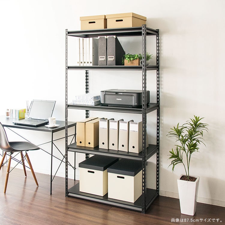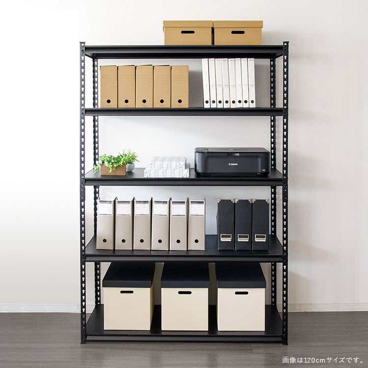 お好みの位置に設置できる5枚の可動棚が付いたスチールラック。 デスクサイドに置けばファイルや書類、プリンターなどオフィス周りに必要なものをまとめて収納できます。 カラーはブラック、ホワイトの2カラーからお選びいただけます。 ●商品サイズ(cm) 幅約120×奥行約45×高さ約183 ●商品重量 約27.6kg ●材質 フレーム:スチール(粉体塗装) 棚板:パーティクルボード(メラミン加工) ●組み立て式