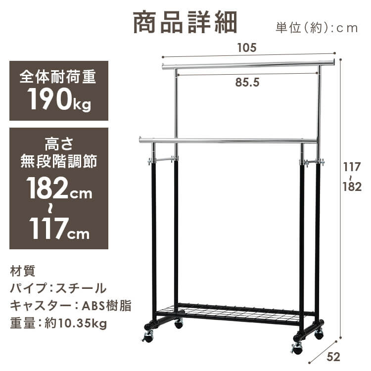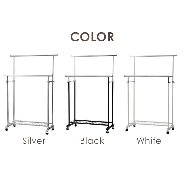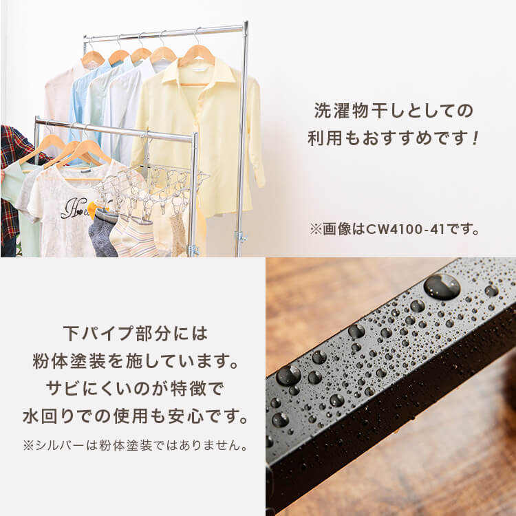 服をかけても、移動しても、グラつかない耐荷重120kgタイプのパイプハンガーです。足元にはメッシュ棚がついており、バッグや収納ボックスも一緒にスッキリ収納できます。