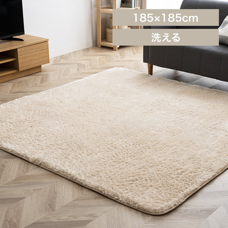 【商品説明】ふんわりとなめらかなシャギーラグです。ラグの毛足は約20mmの長毛パイルで、手足を優しく包み込んでくれるようなボリューム感。吸湿速乾性が高く、繊維の中に空気をため込むので、オールシーズン快適にお使いいただけます。中材には厚み10mmのウレタンフォームを使用し、底づき感のない快適な踏み心地です。ウレタンフォームは音や衝撃をやわらげる特性があり、防音効果が期待できます。裏面には滑り止め加工を施しているので、ペットや小さなお子様にも安心です。【商品仕様】●商品サイズ(cm)幅約185×奥行約185(約2帖)●商品重量約3.1kg●材質表地:ポリエステル100%カットパイル毛足長さ:20mm裏地:不織布(PVC滑り止め加工)詰め物:ウレタンフォーム(10mm)●ホットカーペット・床暖房対応○●洗濯×●カラーベージュ・モカブラウン・グリーン・アイボリー・グレー
