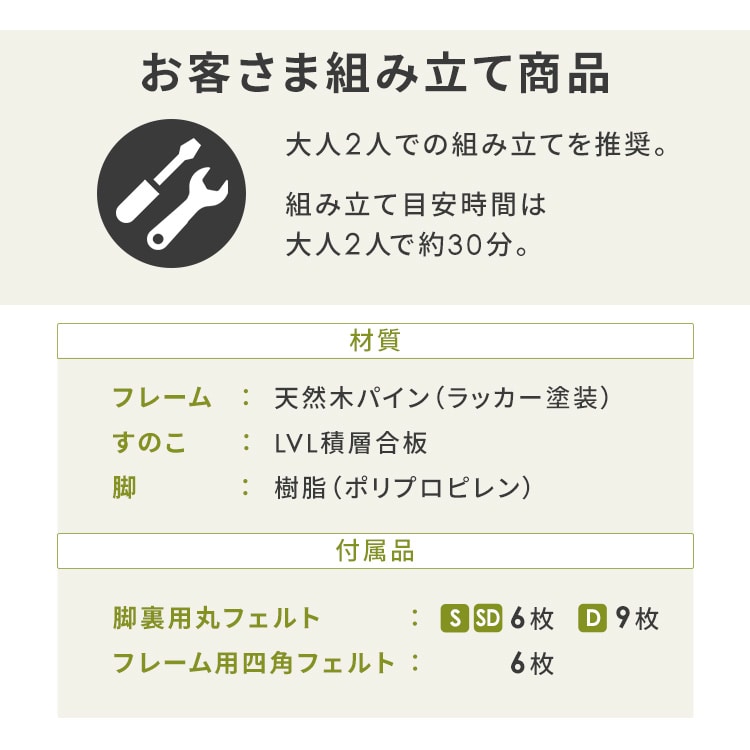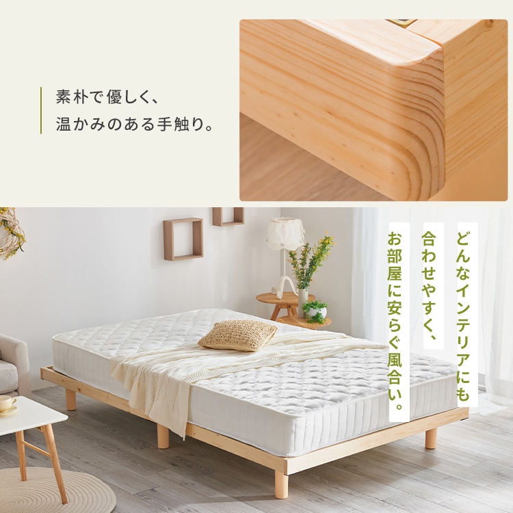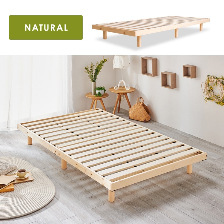 【商品説明】高さ2段階、場所を選ばないヘッドレスタイプのがっちりスノコベッドです。〇パイン天然木の木目が楽しめるナチュラルテイストフレーム〇どんなお部屋にも合わせられるシンプルなデザイン性【商品仕様】●商品サイズ(cm)幅約140×長さ200×高さ約6.5(下位設定)・23.5(上位設定)●ベッド下高さ(cm)下位設定:約0上位設定:約17●仕様フレーム:天然木パイン(ラッカー塗装)床板:LVL積層合板脚:樹脂(ポリプロピレン)●耐荷重200kg●付属品脚裏用丸フェルト6枚、フレーム用四角フェルト6枚●カラーホワイト・ナチュラル・ブラウン●備考組立時間目安大人2人で約30分