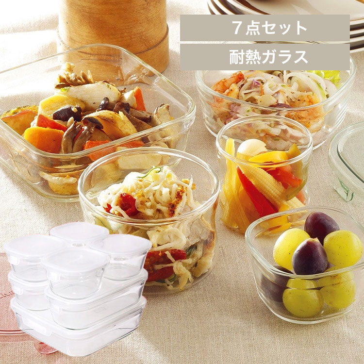 【商品説明】冷蔵庫から取り出して、そのままレンジへ。中身が見えるから使い忘れることもなく、上手に保存して手早くクッキング!フタをはずせばオーブンにも使用可能です。【商品仕様】●セット内容200ml×4個、500ml×2個、1.2L×1個●サイズ(cm)200ml:幅約9.3×奥行約9.2×高さ約5.4500ml:幅約18.6×奥行約9.3×高さ約5.51.2L:幅約18.5×奥行約18.5×高さ約5.5●本体重量200ml:約160g500ml:約330g1.2L:約650g●材質本体:耐熱ガラス、蓋:ポリカーボネイト●機能電子レンジ、オーブン、食洗機使用可 (フタはオーブン・食洗機使用不可)