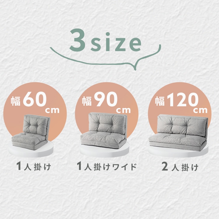 【商品説明】◆背もたれ:14段階リクライニング機能式。(フラット時含む)◆スタイルに合わせ3通りの使用方法を提案します。(1)クッション折り畳みの状態では通常の座椅子としての使用スタイル。(2)座面の広げると座面に奥行が出てロングサイズに!オットマンのような使用方法ができるカウチスタイル。(3)背もたれのクッション部を広げ、背もたれをフラットに倒して使用すれば、お昼寝もできるゴロ寝スタイル。◆ワンルームに最適なコンパクトなサイズの一人用座椅子&マットです!◆生地はさらりとした触り心地で素材感のあるファブリック生地を使用しています!◆背もたれ部のクッションが取り外せる簡易コンパクト梱包仕様で運び入れもしやすい。【商品仕様】●商品サイズ(cm)・ソファ(折りたたみ時)幅約60×座面の奥行約66×高さ約61・フラット時幅約60×座面の奥行約205×高さ約10●商品重量約7.7kg●材質表地:ポリエステル100%裏地:ポリエステル100%中材:スチールパイプ、ウレタンフォーム、ウレタンチップ