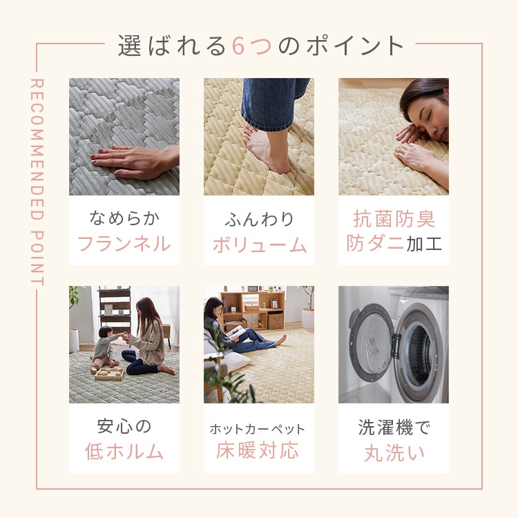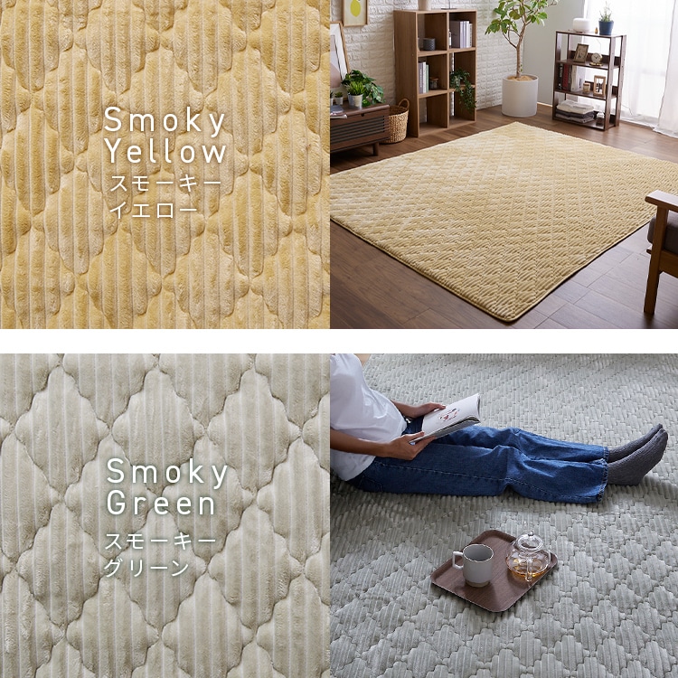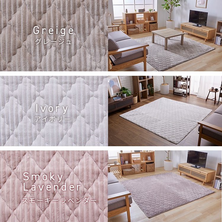 【商品説明】ふんわり滑らかな触り心地で気持ちいいボリューム感のラグ。ダイヤモンド模様のかわいいキルティング。おうちで洗えていつでも清潔。【商品仕様】●商品サイズ(cm)幅約190×奥行約190●商品重量約2.33kg●材質表地:ポリエステル100%(フランネル)裏地:ポリエステル100%+滑り止め加工中綿:ポリエステル100%(わた/抗菌防臭防ダニ加工)+ウレタン●カラーグレージュアイボリースモーキーラベンダースモーキーイエロースモーキーグリーン