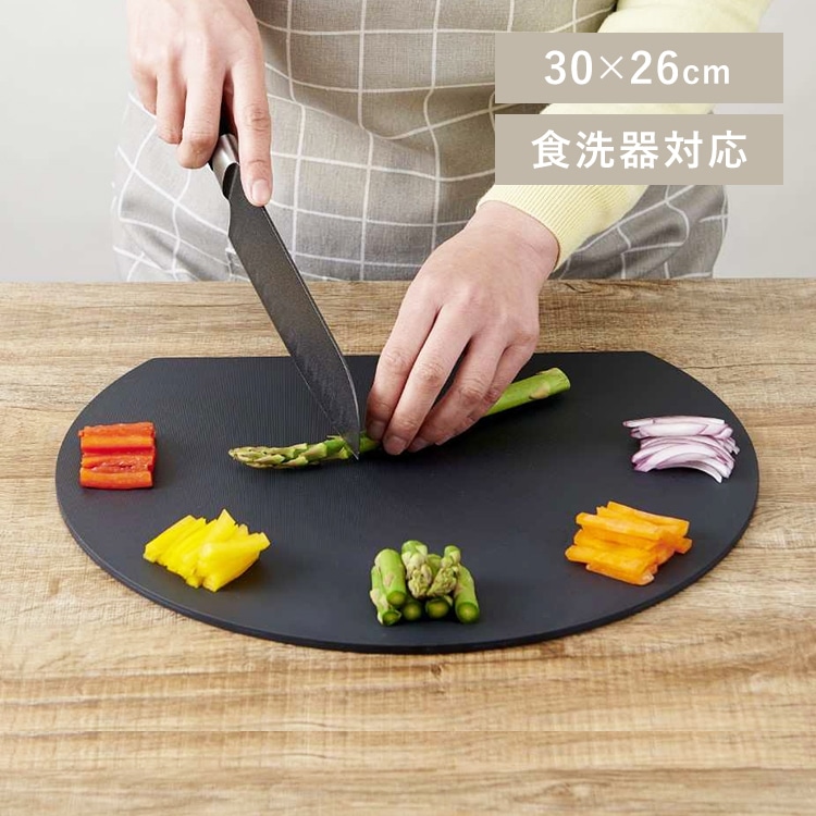 【商品説明】刃あたりが柔らかく食材がすべりにくい、弾力性のある耐熱エラストマーまな板。「木製」と「プラスチック製」のいいとこどり。面積が広い丸形だから、カットした食材を並べて置いてお皿いらず!食卓で切り分け、そのままサーブ。特別感のあるテーブルでおもてなしの場にも。長方形のまな板位に比べて面積が広く、奥行きもあるので、広々使えます。抗菌加工を施しているので、毎日の食事の準備も安心して使えます。食洗機使用OK。耐熱130℃。【商品仕様】●商品サイズ(cm)幅約30×奥行約26×高さ約0.4●商品重量約334g●材質ポリウレタン系熱可塑性エラストマー●耐熱/耐冷温度130℃/-30℃●カラーベージュブラック