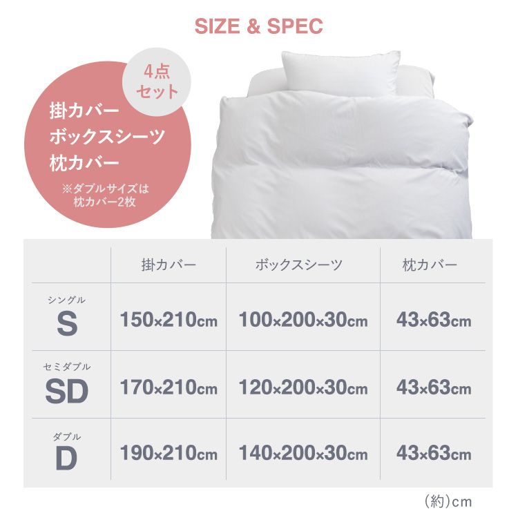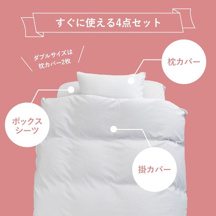 掛布団カバー×1枚、BOXシーツ×1枚、枕カバー×2枚の4点セット!