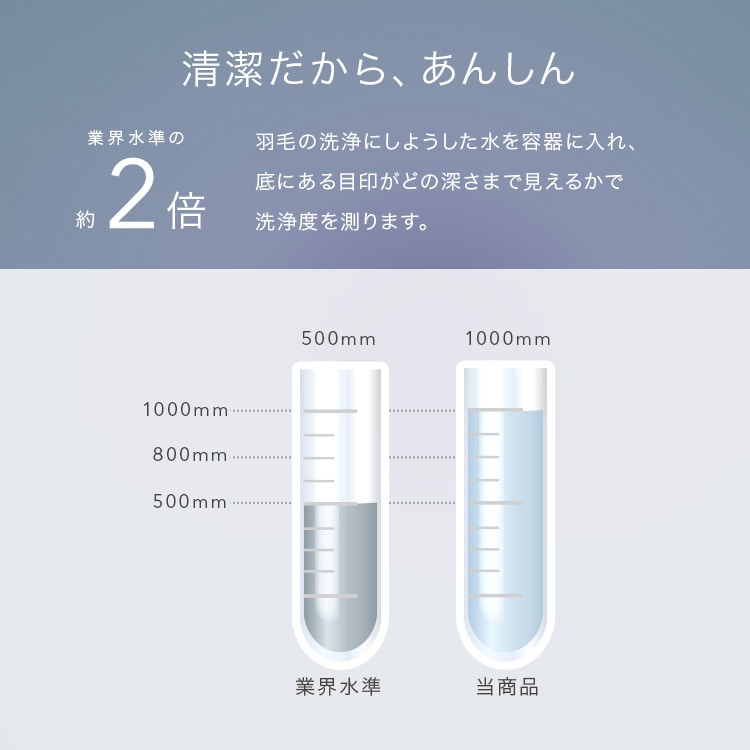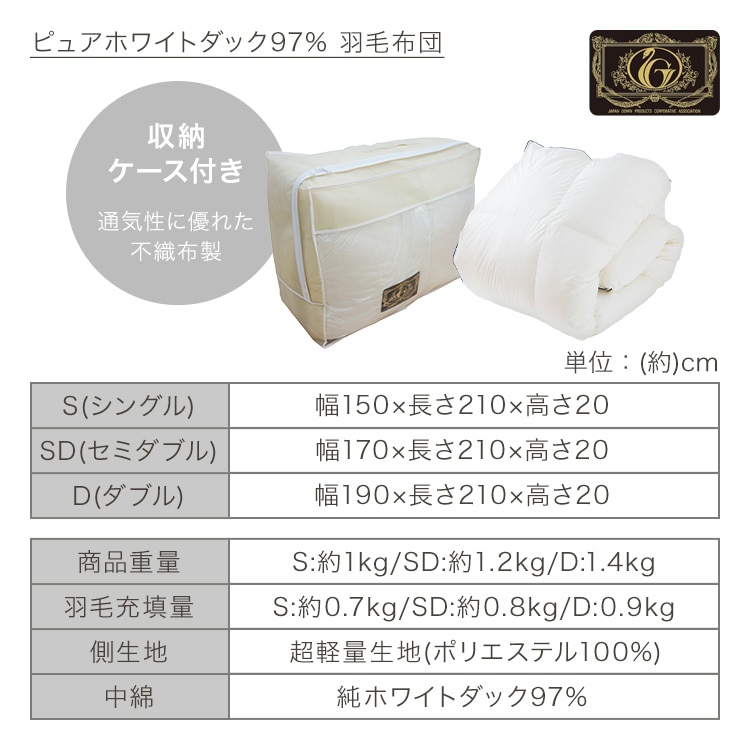 【商品説明】真っ白なピュアホワイトダックダウンを97%使用した極上羽毛布団です。側生地には羽毛布団専用生地の軽量なシルクタッチ生地を使用し、羽毛本来の暖かさをさらに引き出す事でより高い保温性能を実現。到着後は広げて叩きながら空気を送り込むことで、あっという間にふかふかに復元します。軽さと暖かさに包まれる、ふっくら快適な寝心地です。【商品仕様】●商品サイズ(cm)シングル:幅約150×奥行約210×高さ約20セミダブル:幅約170×奥行約210×高さ約20ダブル:幅約190×奥行約210×高さ約20●商品重量シングル:約1kg、セミダブル:約1.2kg、ダブル:約1.4kg●羽毛充填量シングル:0.7kg、セミダブル:0.8kg、ダブル:0.9kg●材質側生地:ポリエステル100%(超軽量55g/m2生地)中綿:ホワイトダック97%、フェザー3%(ピュアホワイトダウン)●ダウンパワー440DP●洗濯表示ネット使用●仕様日本羽毛協会 プレミアムゴールドラベル付き収納ケース付き