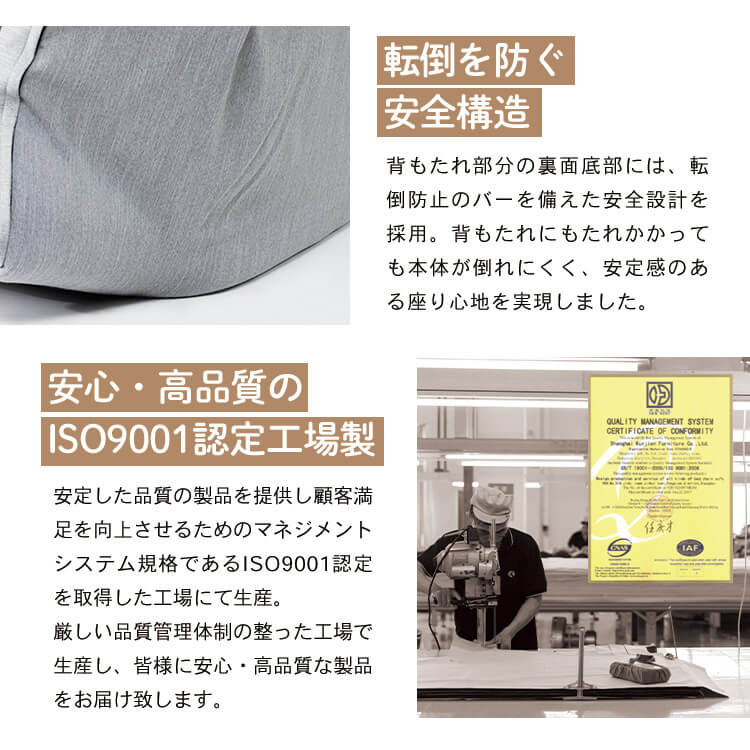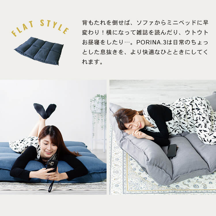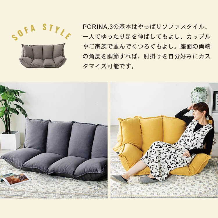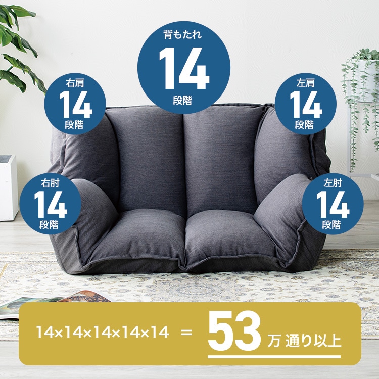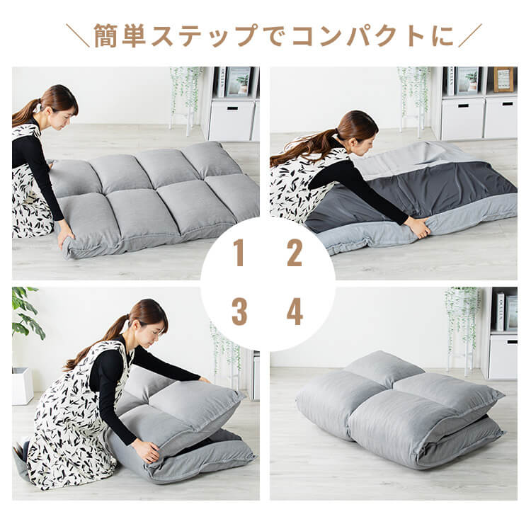 【商品説明】・背もたれ:14段階リクライニング機能式。・肘・背サイド部分※4カ所:14段階リクライニング機能式。・座面及び背もたれ部分の中材に流動性の高いチップウレタンを入れています。・表生地には水を弾く撥水加工を施した肌触り柔らかなショートベロア生地を採用。・裏面にして真中部分から半分に折り畳めるギアを採用し、収納することが可能になったコンパクト仕様です。※実用新案特許取得済【商品仕様】●商品サイズ(cm)幅約105-140×奥行約63-108×高さ約16-56●商品重量約13.2kg●材質表地:ポリエステル100%裏地:ポリエステル100%中材:スチールパイプ、ウレタンフォーム、チップウレタン