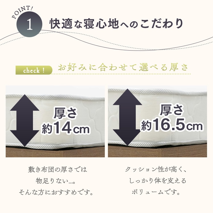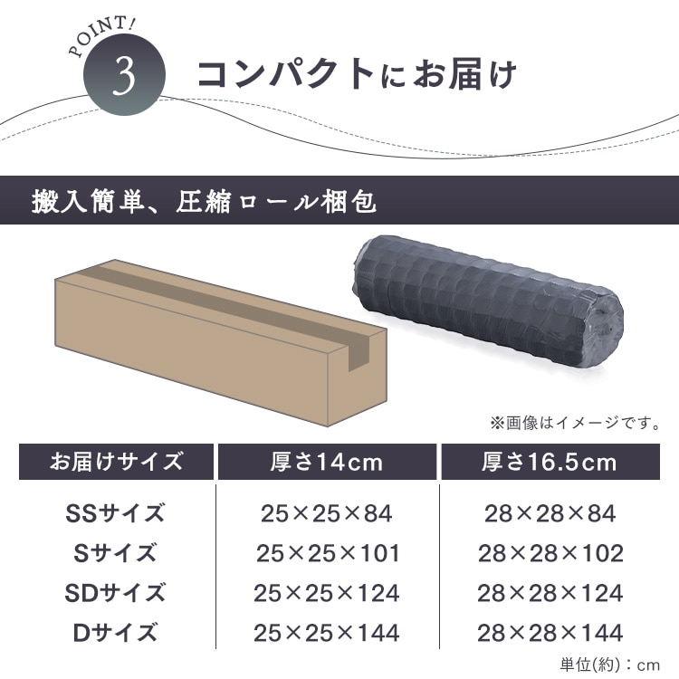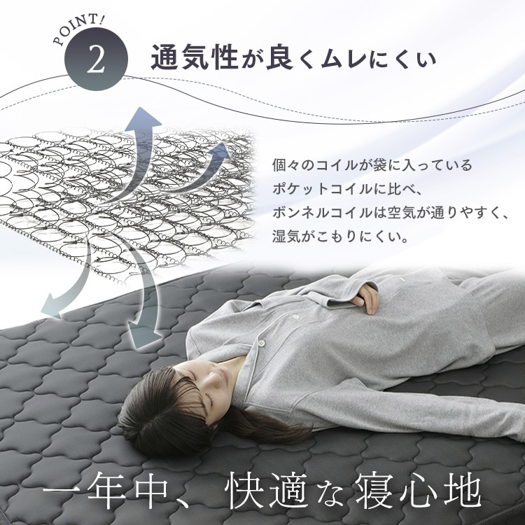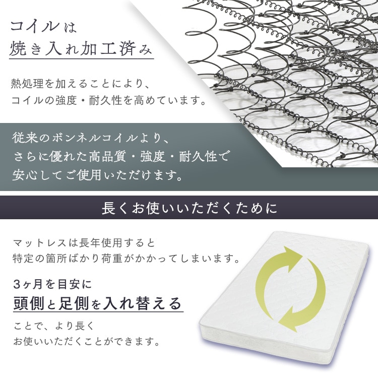 【商品説明】【新商品】既存商品よりもコンパクトな14cmのボンネルコイルマットレスを展開。セミシングル、シングル、セミシングル、ダブルからお選びいただけます。硬めの寝心地がお好みの方におすすめ!高品質ボンネルコイル使用で、体の負担を和らげます。高密度コイル、強度・耐久性に優れたスプリングを採用。コンパクトな圧縮梱包でお届けします。【商品仕様】●商品サイズ(cm)幅約97×奥行約195×高さ約14●商品重量約15.2kg●材質コイルスプリング(線径2.10mm)表生地:ポリエステル100%詰物:ウレタンフォーム(18D)、樹脂綿、フェルト、不織布裏生地:フェルト、不織布●コイル数330個