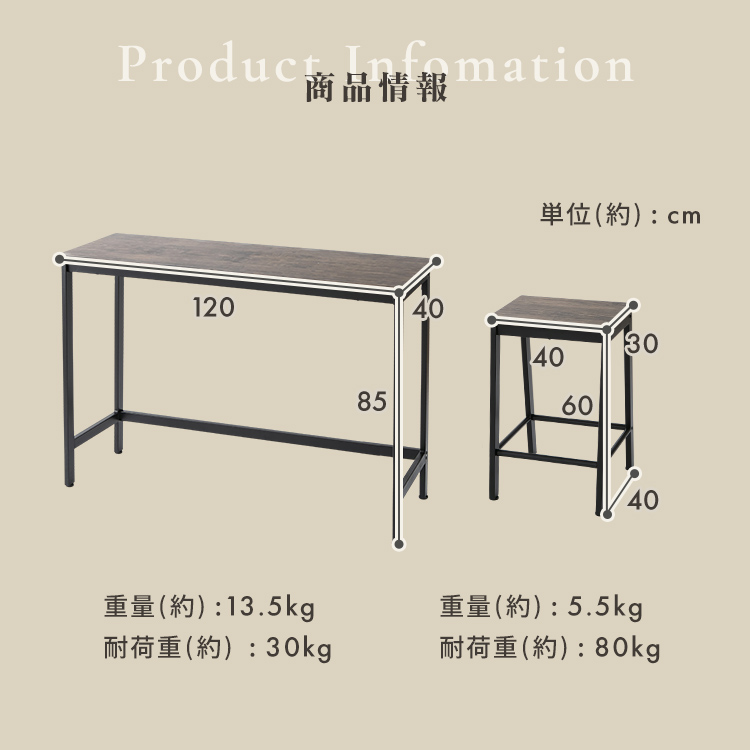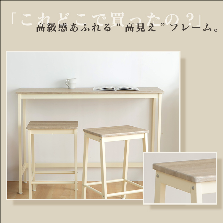 ※2026年1月10日 ストーングレーを追加しました。 2人用にぴったりサイズの、ハイテーブルダイニング3点セットです。 120×40cmの天板サイズで、省スペースにも対応。 シンプルなデザインで、オフィスや店舗用としても。 専用工具付きなので組立も簡単です。 ●商品サイズ(cm) 幅約120×奥行約40×高さ約85 ●商品重量 約13.5kg ●材質 テーブルサイズ:幅120x奥行40x高さ85cm 重量13.5kg チェアサイズ:幅40x奥行40x高さ60cm 重量5.5kg 座面サイズ:幅40x奥行30cm 天板・座板:PVC貼り(MDF、18mm厚) フレーム:スチール(□40×20mm) 粉体塗装 耐荷重:テーブル:30kg チェア:80kg ●組立の有無 有 ●組立時間 大人1人で50~60分