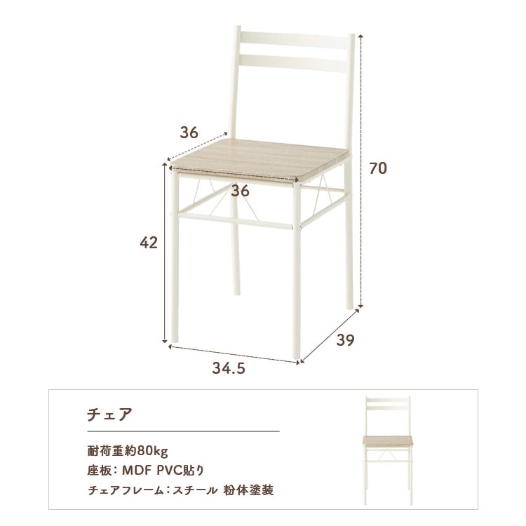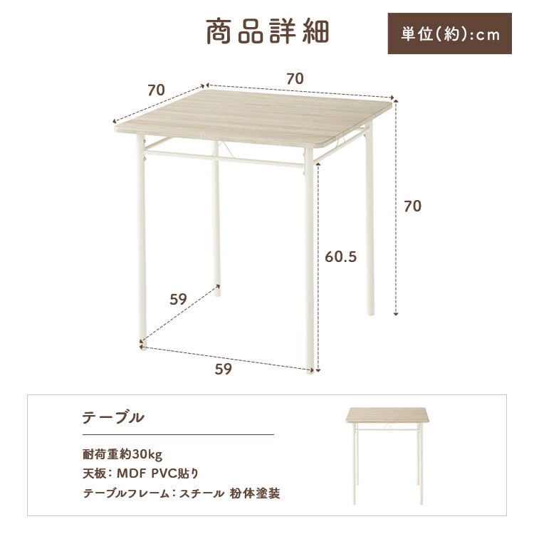 ※2026年1月10日 ストーングレーを追加しました。 コンパクトでスマートなダイニング3点セット。 ※こちらの商品は、お客様組み立て品です。 ●セット内容 テーブル×1、チェア×4 ▽テーブル W70×D70×H70(cm) 耐荷重:約30kg 材質:天板)MDF・PVC貼 テーブルフレーム】スチール・粉体塗装 ▽椅子 W34.5×D39×H70(cm) 耐荷重:80kg 材質:座板)MDF・PVC貼 チェアフレーム:スチール・粉体塗装 ▽椅子脚部分 傷防止キャップ