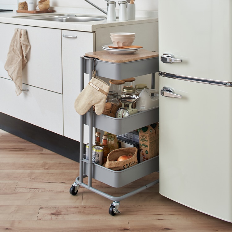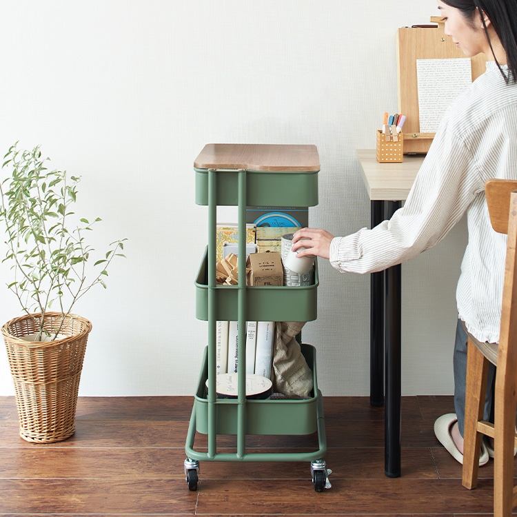 天板付きで、見せるためにも隠すためにも使えるワゴン◆便利で丈夫な天板付き物を置いたりディスプレイすることも可能取り外しておぼんの代わりにも!天板をかぶせて収納品が見えなくなることで すっきりとした見た目に。丈夫なメラミン素材使用で、湿度に強く、水をこぼしても染み込みにくい。天然木よりも頑丈な素材でキズに強く、熱いものや鋭利なものを置いても大丈夫!◆支柱パイプとバスケットが連結し、組立ラクラク!◆支柱パイプが端にあることでスペースが空き、左右から取り出しやすい!◆丈夫な作りスチール素材で変形しにくい全体耐荷重は60kg(各段20kg)丈夫なのでボトルなども重いものも収納可能サビにくい粉体塗装仕上げ●商品サイズ(cm)幅約46.3×奥行約34.9×高さ約78.6●商品重量約7.4kg●材質天板:合成樹脂化粧パーティクルボード(メラミン樹脂)スチール(エポキシ樹脂塗装)●耐荷重バスケット(1個あたり):20kg、全体:60kg(検索用:収納家具 キッチン家具 キッチンワゴン キャスター 付き 天板 キッチン 収納 ワゴン 洗面所 )
