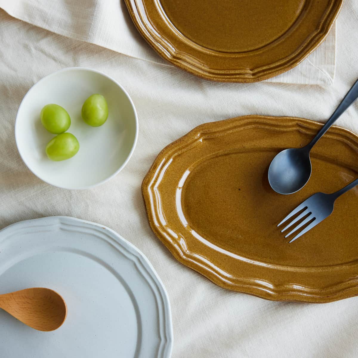 温かみのあるアンティークのような食器は、シンプルなデザインながらも縁の装飾がさりげない華を添えます。