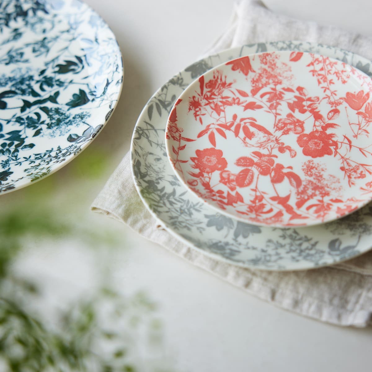 無駄のないマットな白い器とモダンな花柄がお互いを引き立て、テーブルコーディネートをより一層楽しめます。