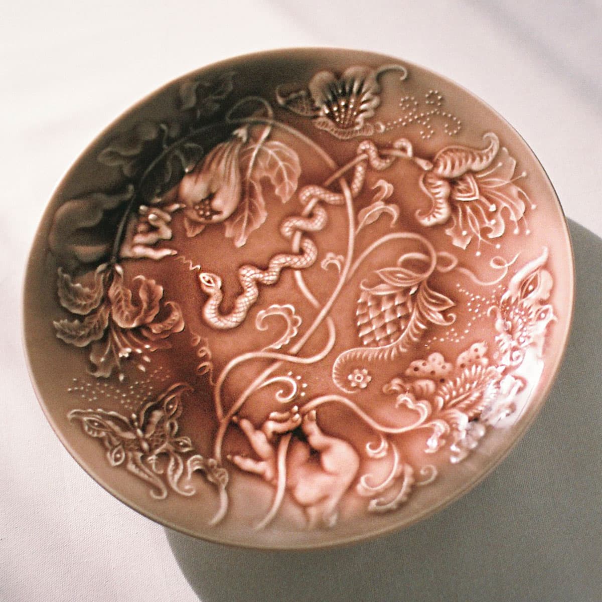 絵柄の中には、手にすることが禁じられている「禁断の果実」、イブに禁断の果実を食べるように唆した「蛇」、