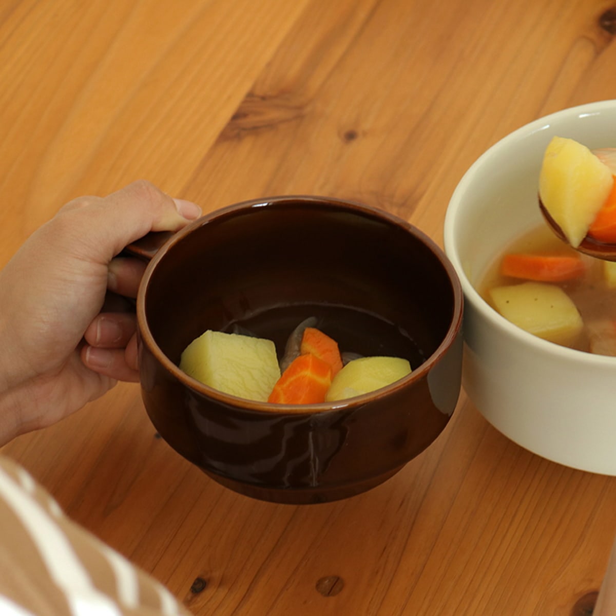 直径約12cmの大きな飲み口のスープマグは、スープやシチュー、鍋の取り分けなど様々なシーンで活躍するアイテムです。