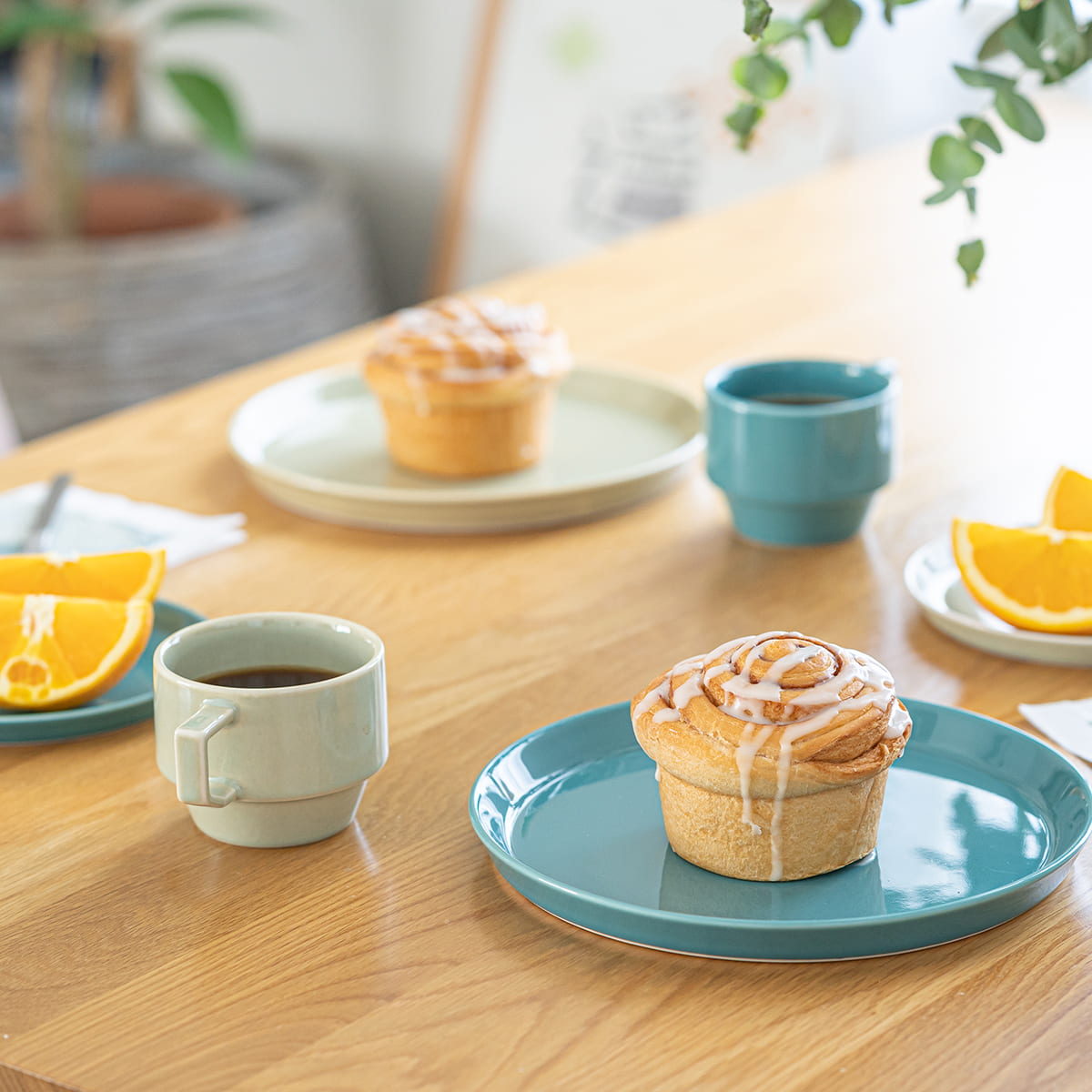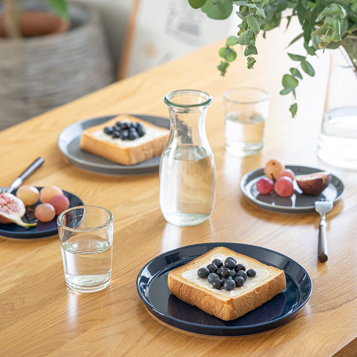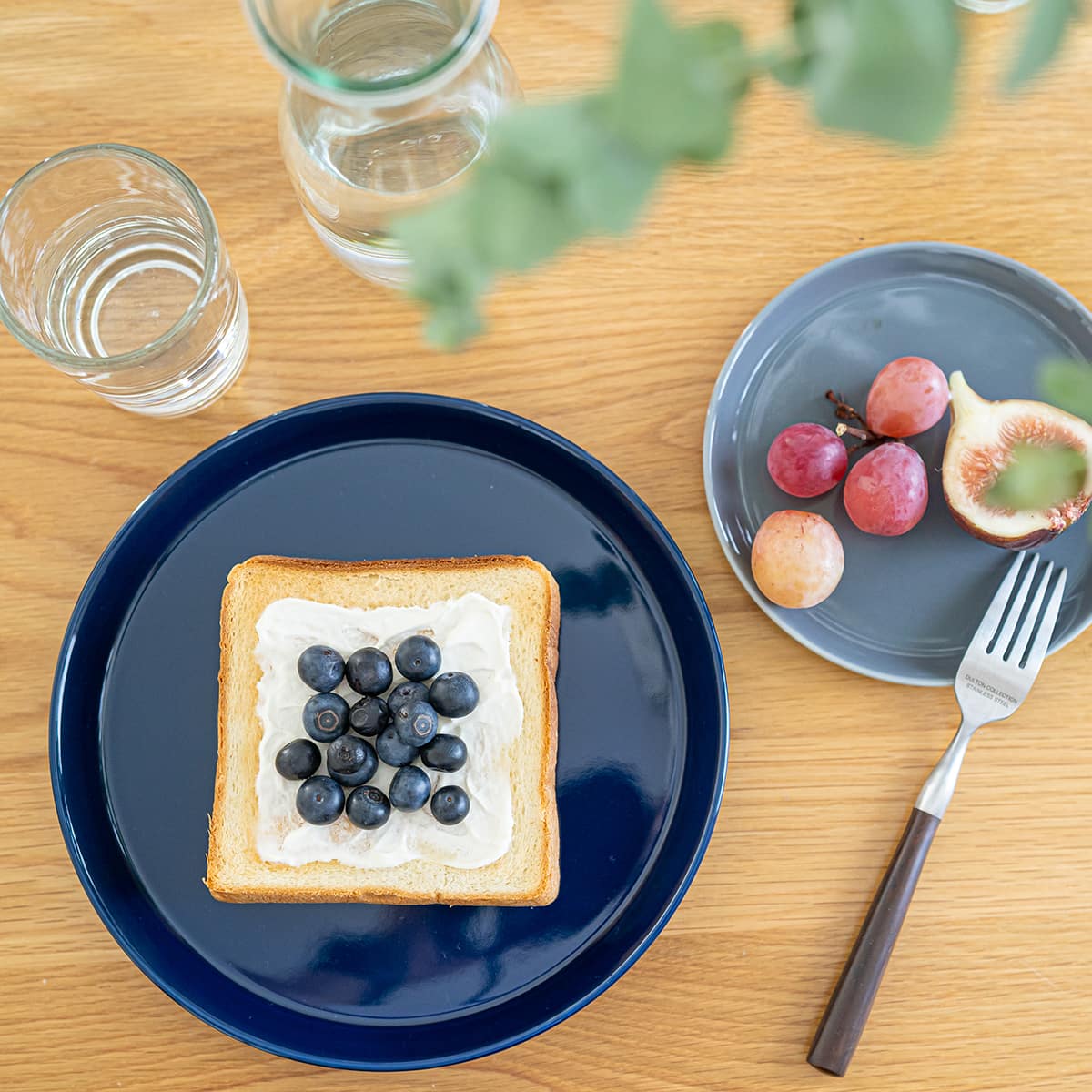 直径22cmで、食パンの脇にサラダやフルーツなど盛り付ける事ができるサイズ感です。 和食器に使用されていた釉薬を中心に使用しているので、落ち着いた深みのある色合いで、様々なお料理に合わせやすくなっております。