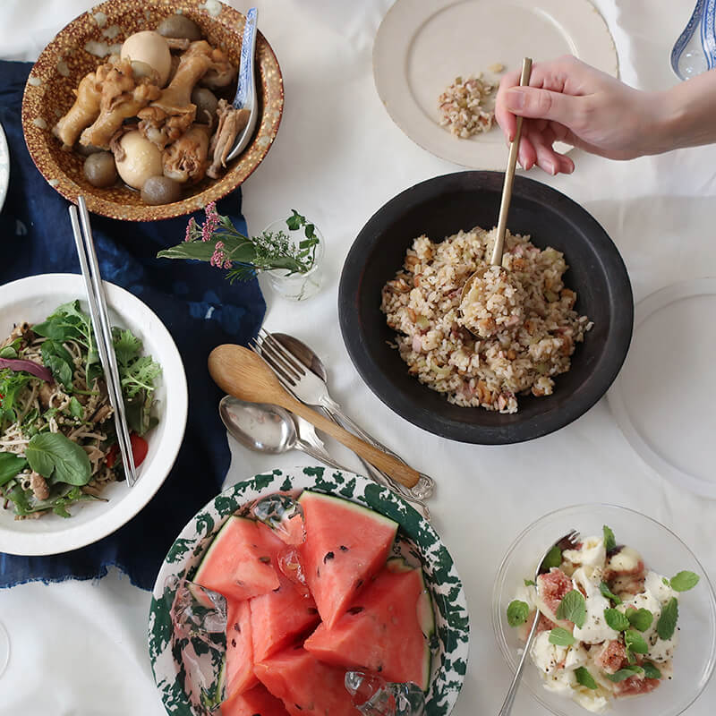 朝食のフルーツとパンを盛り付けてみたり、お寿司を盛り付けてみたり・・・ホームパーティのときに盛り鉢としていろんなおかずを盛り付けてもいいですね。