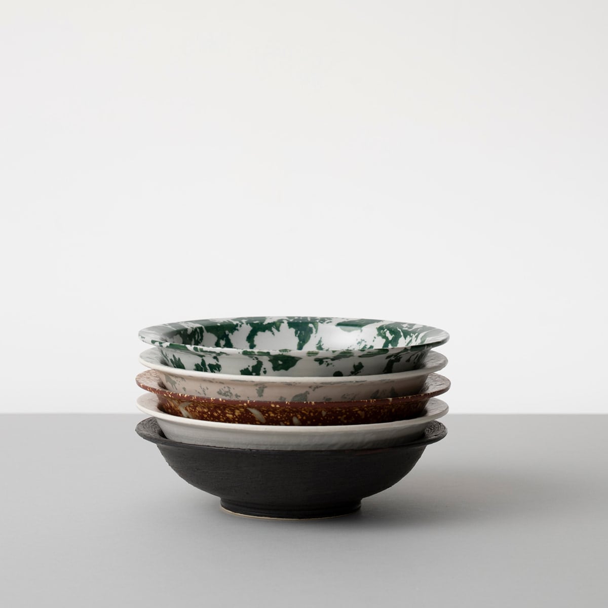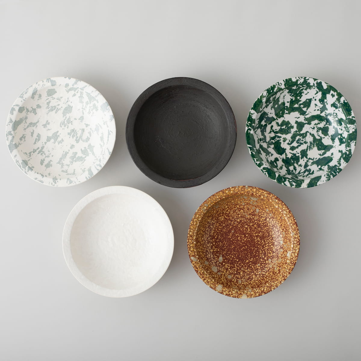 色の濃淡や素材の質感の混ざり合いが織りなす「まだら模様」にはひとつとして同じものはなく、ひとつひとつの器が自然界の生み出す「表情」を描き出しています。