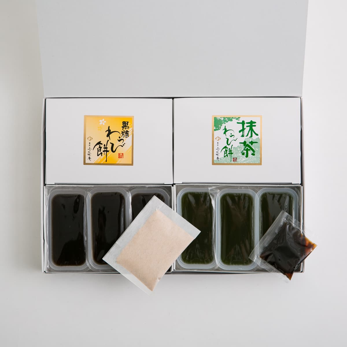 内容量:【抹茶わらびもち(60g×3)、黒蜜10g】×2箱、【黒糖わらびもち(60g×3)、きな粉6g】×2箱 原材料名:黒糖わらび餅 : 黒糖(沖縄県製造)、水飴 米酢、 コンニャク粉、 餅 粉、食塩、本わらび粉、 くず粉/加工澱粉、増粘多糖類、pH調整剤 (クエン酸 《添付品》 きな粉6g( 大豆) / 抹茶わらび餅 : 水飴 (国産)、グラニュー 糖、宇治抹茶、コンニャク 粉、 くず粉、 本わらび粉/ 加工澱粉、増粘多糖類、ト レハロース、pH調整剤 ( クエン酸) 《添付品》 黒蜜 10g (黒糖、水飴) 保存方法:常温 賞味期限:製造日より60日