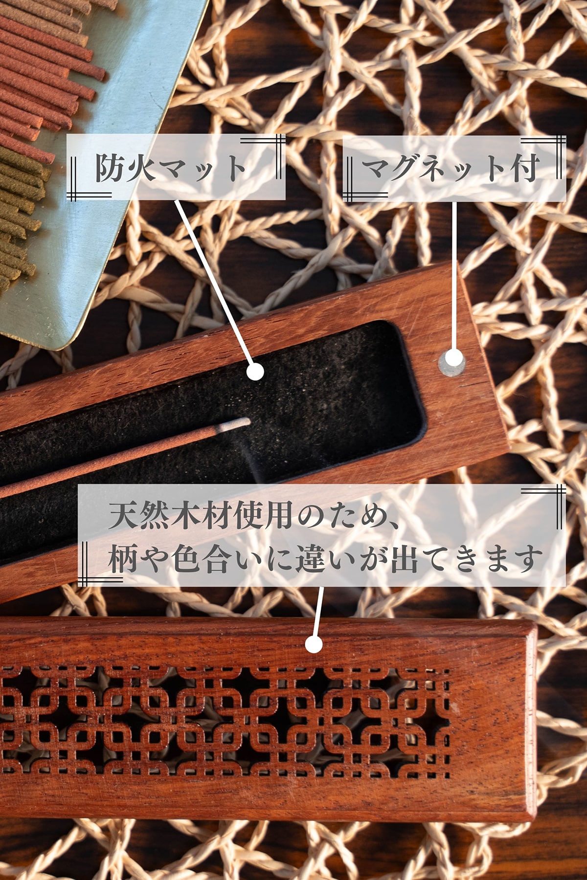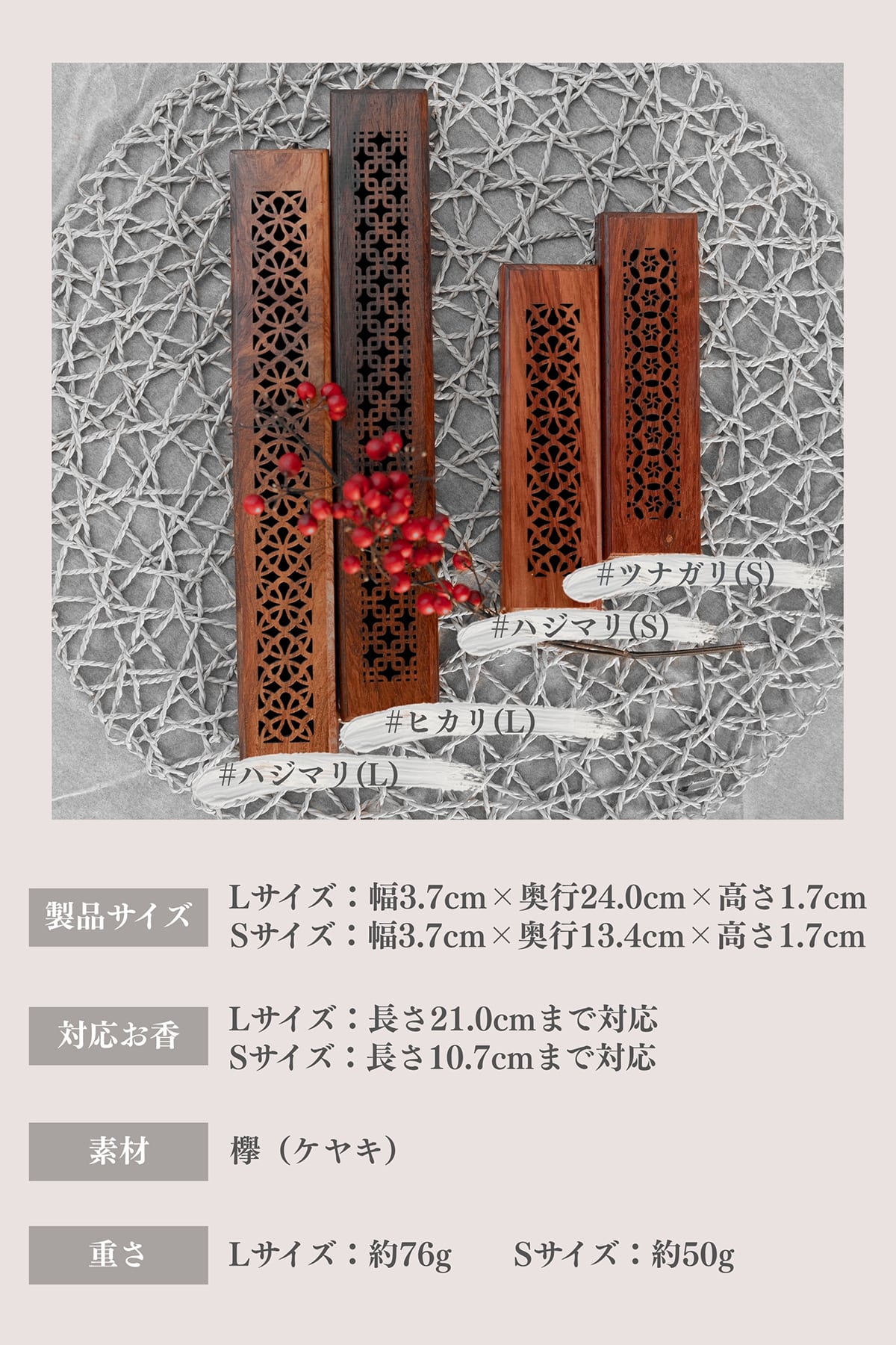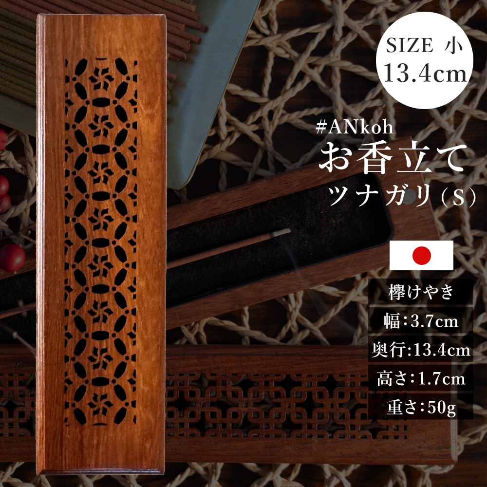 【お香:お香立て】 #ANkoh ツナガリ(S) ●幅:3.7cm ●奥行:13.4cm ●高さ:1.7cm ●重さ:50g ●素材:欅けやき ●エアコンの風でも倒れない安心設計 おいて使えるお香立てなのでエアコンの風などで倒れる心配がありません。 また、灰が飛び散る心配もなく、場所を選ばずお使いいただけます。 ●置くだけで様になるインテリア性 ●防災マット/マグネット付き ●天然木材使用のため、柄や色合いに違いがでてきます。