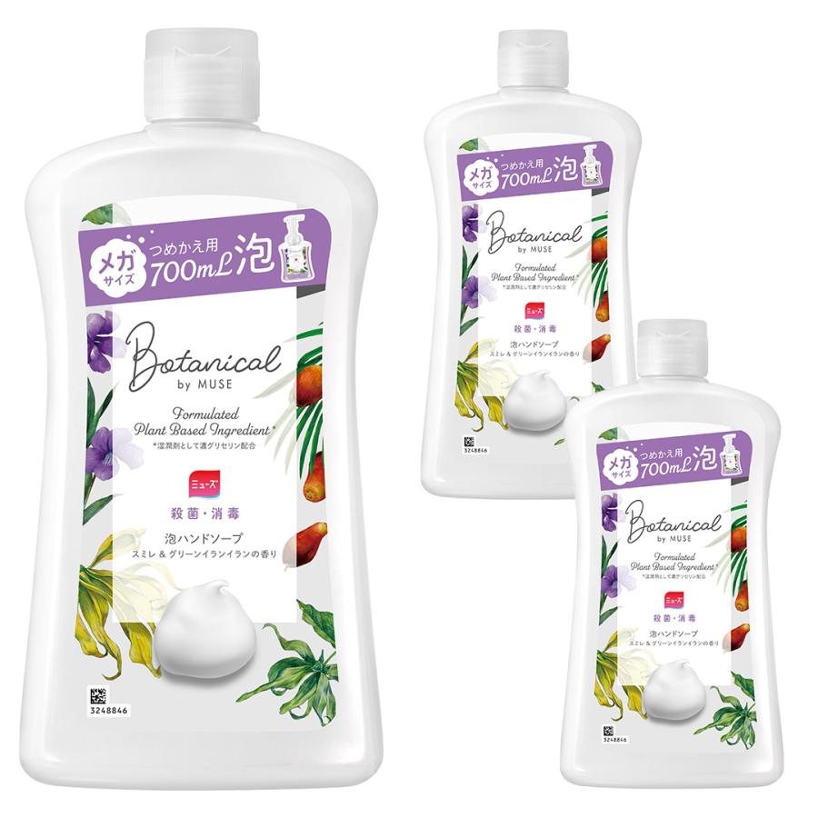 泡ミューズボタニカルメガサイズ詰替700mL 3個セット 【薬用せっけん ミューズ 泡ハンドソープ ボタニカル 詰替え ボトル メガサイズの商品詳細】 ●トータル予防*1処方 ●ボタニカルbyミューズ泡ハンドソープ ●スミレ&グリーンイランイランの香り ●「Botanical by Muse(ボタニカルbyミューズ)」は、肌に近いpHで、殺菌成分配合の泡ハンドソープ。植物由来の保湿成分*2、植物由来の2種類の洗浄成分*3を配合しています。 *1 体臭・汗臭・にきびを予防すること *2 湿潤剤として濃グリセリン *3 洗浄剤として