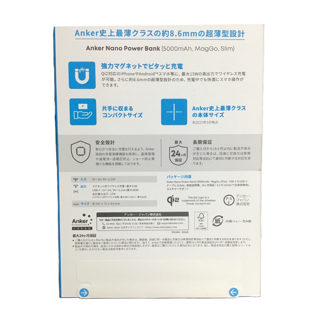 ・約8.6mmの薄型設計:約8.6mmの薄型設計でポケットやポーチにも収納可能なコンパクトさを実現。外出時などの持ち運びにも便利です ・Qi2対応でスマホ約1回分充電可能:マグネット式ワイヤレス充電対応のモバイルバッテリーで、Qi2対応のスマホに最大15W出力かつ約1回分のワイヤレス充電が可能です。 ・充電しながらの操作が快適:ケーブルを使用しないため、充電中でも快適にスマホを操作できます。 ・Wireless PowerlQ搭載:Anker独自技術のWireless PowerlQを搭載し、充電時間の短縮と放熱性の向上を実現。 さらに、ActiveShield?2.0により、常に温度を計測し制御するため、お使いの機器を24時間守ります。 ・ケーブルでの急速充電も可能:製品底面のUSB-Cポートは最大20Wでの入出力に対応。スマホもバッテリー本体にも急速充電が可能です。 【使用上の注意】 同梱のマニュアルをよく読んだ上でご使用ください。 本製品を電気ウェアや空調服などの電源として使用しないでください。 また、ポケットに入れたままでの使用など、直接肌や衣類に触れた状態で使用しないでください。