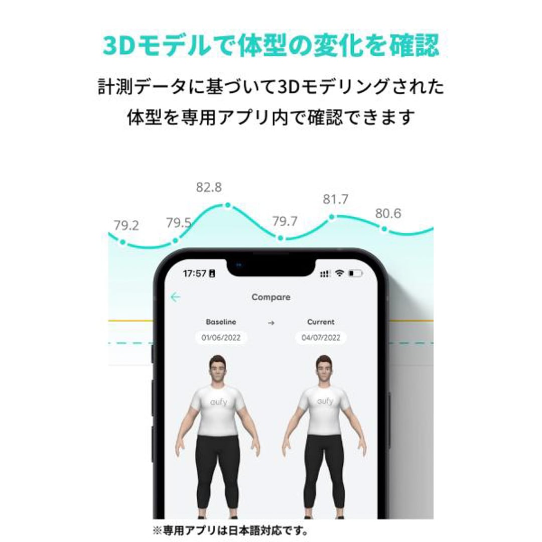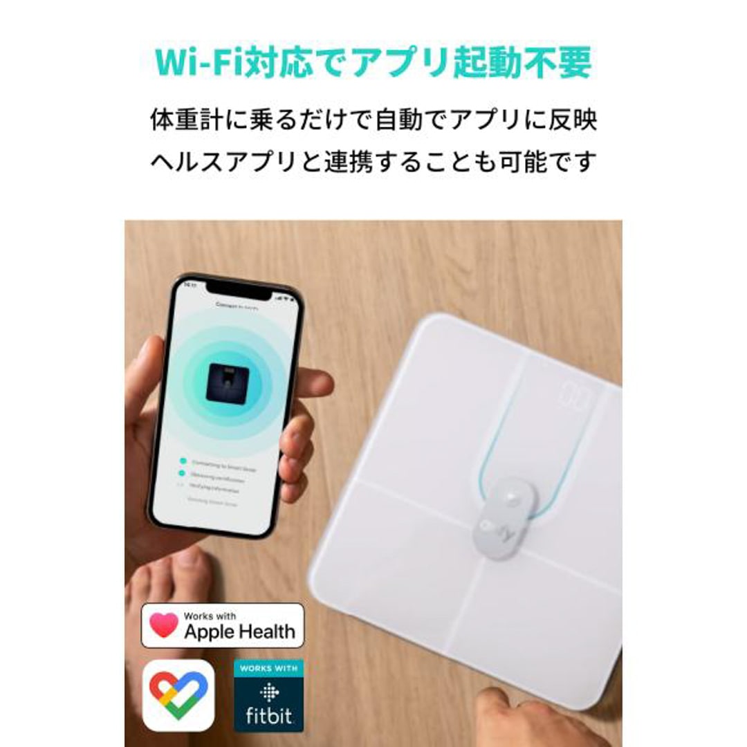 16の項目でカラダ全体を測定:体重やBMI、体脂肪率などの基本情報のみでなく、心拍数、筋肉量、骨量、体年齢、皮下脂肪率などのカラダに関する16の項目を測定できます。 Wi-Fi / Bluetooth接続に対応:Wi-FiまたはBluetoothを使用して専用アプリに接続することで、データを自動的にアップロード。登録人数の制限なくご使用いただけます。 アプリへのデータ連携:専用アプリ内のデータは、AppleのヘルスケアやGoogle Fit、Fitbitと同期することができるため、体型管理に役立つデータをまとめて管理できます。 高感度センサーを搭載:高感度センサーにより最小50g単位での測定が可能で、赤ちゃんやペットなどの体重管理にも最適。表面に ITOコーティングを施しているため、どの位置に乗っても測定が可能です。