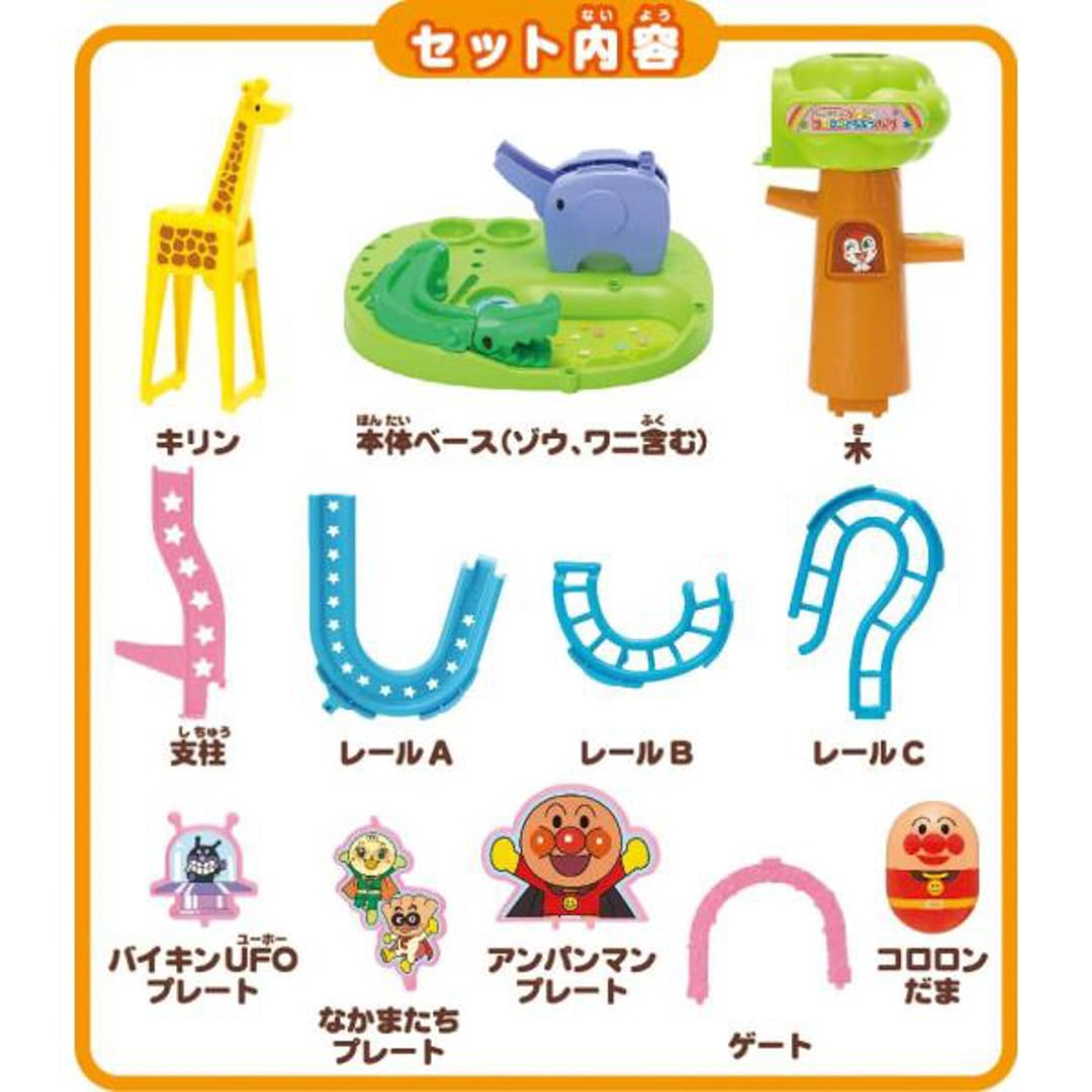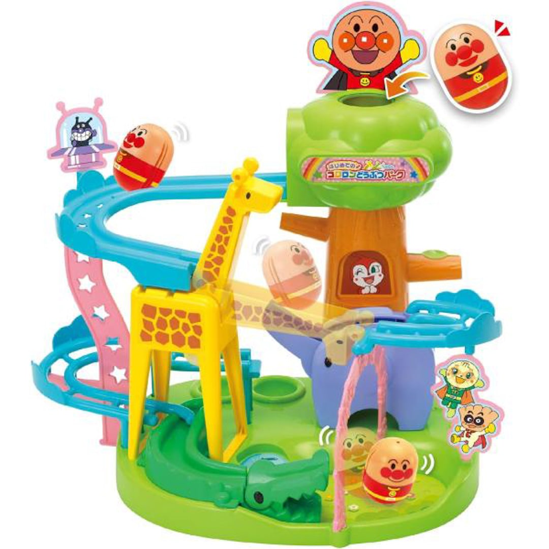 コロロンどうぶつパーク! ! キリン、ゾウ、ワニのどうぶつたちが動いてコロロンだまをレールに渡してくれるよ! 楽しい3つのギミックの動きで、何度も繰り返し遊びたくなる! お子様に人気のどうぶつテーマのコロロンが登場! コロロンのどうぶつパークは、木の上の穴からコロロンだまを入れるとレールを伝ってどうぶつたちのところへ転がります。 キリンは首をさげて、レールに渡してくれます。 ゾウは鼻をつたって、ワニは頭の上を通って、口をパクパクさせて、ゴールまでコロロンを転がします。 たのしいギミックが3つもついているので、何度も繰り返し遊びたくなります。 アンパンマンのコロロン玉が1個ついてくるよ☆