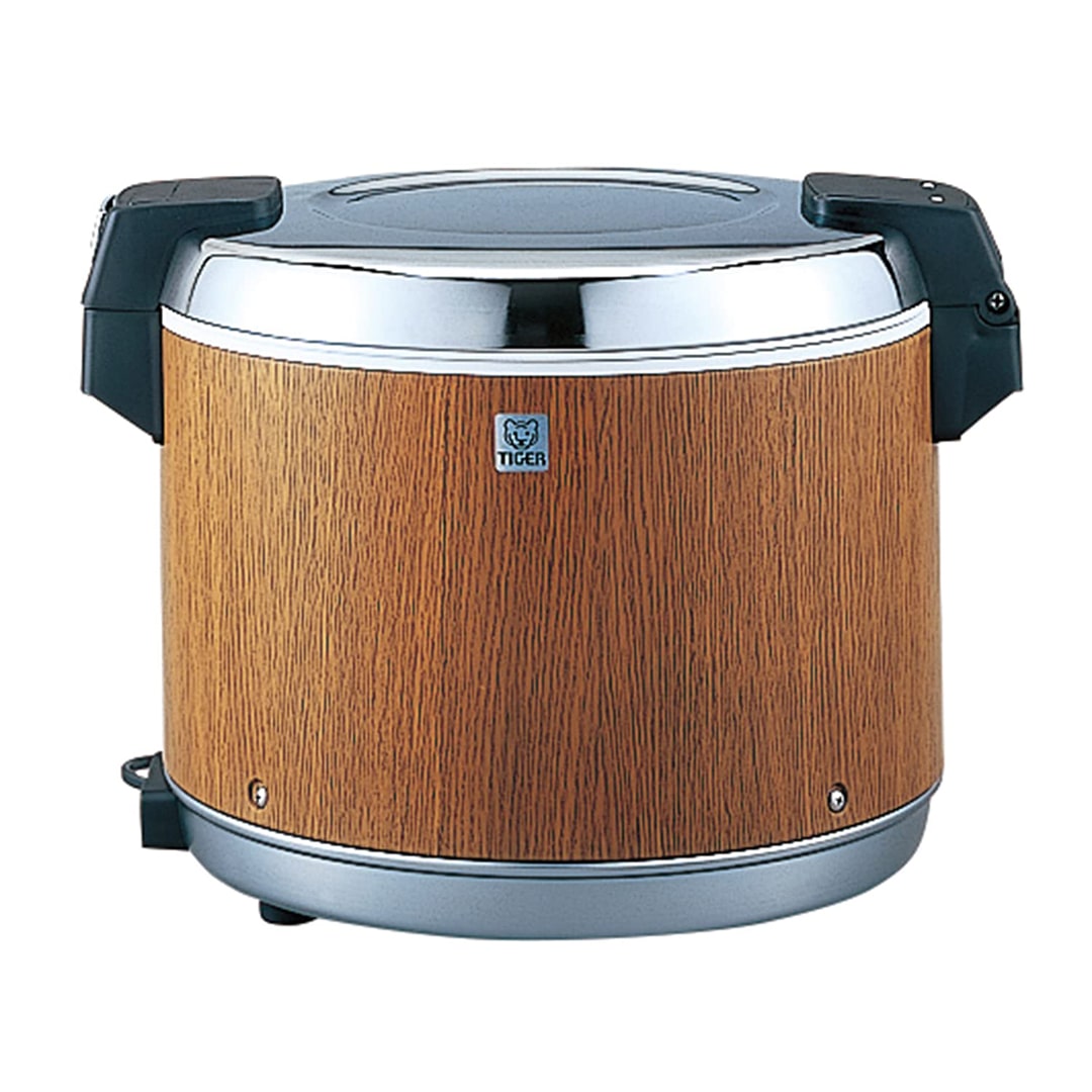 ダブルヒーター方式で大量保温の業務用。 内容器はごはんがこびりつきにくい、フッ素樹脂加工。
