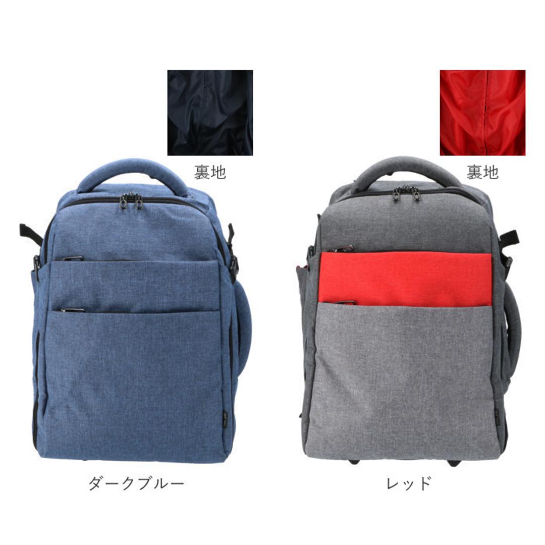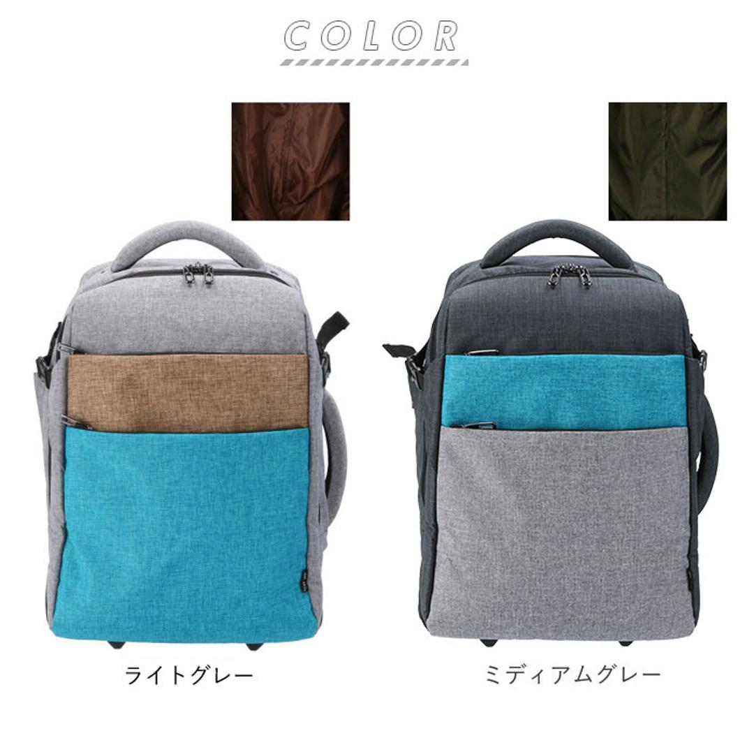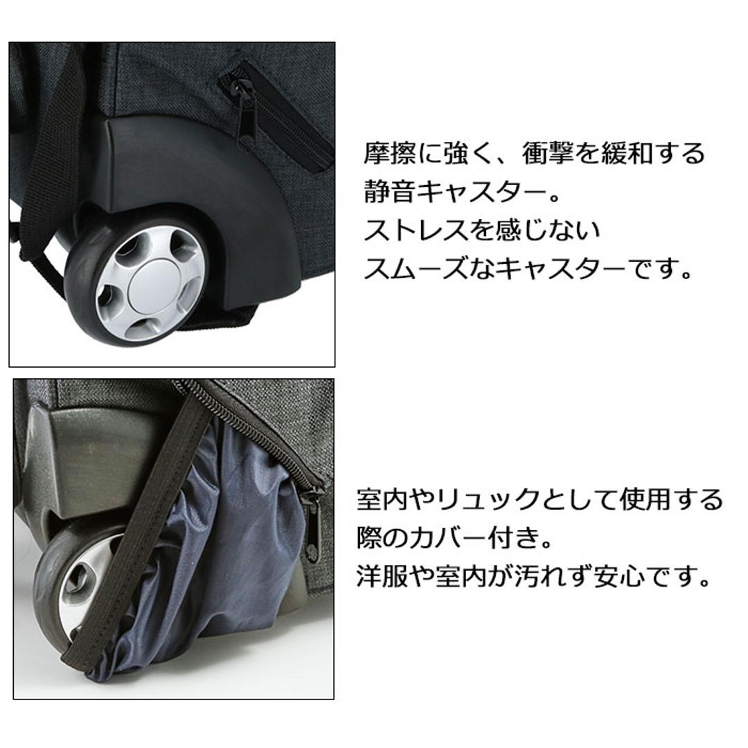 | 商品説明 | ・キャリーケースだけど、カチッとしすぎないデザイン!素材感のあるポリエステルキャンバス生地した、カジュアルなリュック&キャリー。 ・キャリーケースとしてだけでなく、背面からショルダーベルトを引き出し、リュックとしても使用できる2WAY仕様。本体にポリエステルキャンバス生地を使用することで、ハードケースタイプのキャリーケースより軽量で、リュックとしても使いやすい♪ ・フロントに、深さの違うファスナーポケットを2重に配置したユニークなデザイン。ポケットの生地色を切り替えたポップなカラーと、単一カラーのシンプルなデザインを選べるのも嬉しい。 ・上部ファスナーポケット内は、内ポケットが充実!スマートフォン用ポケット×1、オープンポケット×4、ペン挿し×2で、散らかりがちな小物もすっきり整理して収納できる。 ・メイン収納開口部はダブルファスナー式。スーツケースのようにラウンド型に側面下部まで大きく開くので、衣類や小物の出し入れがラクラク。小旅行やアウトドア用として、2泊3日程度の衣類やポーチが収まる大容量なのが嬉しい。 ・メイン収納内部には、ノートPCやタブレット端末が収納できるポケット付き。クッション性のある生地で、大切なモバイル端末の持ち運びも安心。 ・外側サイドには、500mlペットボトルを収納できるメッシュポケット付き。使わないときにはファスナーを閉めてたたみこめば見た目もすっきり。さらに反対側サイドには小物が収納できる独立型ファスナーポケットも。 ・ショルダーベルトは緩やかな曲線を描くS字状で、身体にフィットして方に負担がかかりにくい造り。リュックとして使わないときはファスナーの中にベルトをすっきりと収納可能! ・側面のバックル式調整ベルトでマチの大きさを調整可能。荷物が少なめの時はスマートなシルエットで使用できる。 ・リュック背面側に、キャリーケースのバーに通して使用できるベルト付き。ハードケースタイプのキャリーケースと併用して、旅行用のサブリュックにも使いやすい。 ・柔らかなグリップ感の持ち手は、上部と側面の2か所にあり、手持ちにしやすい。また、キャリーケースのバーはファスナー内に収納できるので、リュックとして使用するときも邪魔にならない。 ・キャリーケースを室内置きするときや、リュックとして背負う時に便利なキャスターカバー付き。キャスター上部のファスナーからカバーを引き出し、車輪をすっぽりとカバーできる。 |