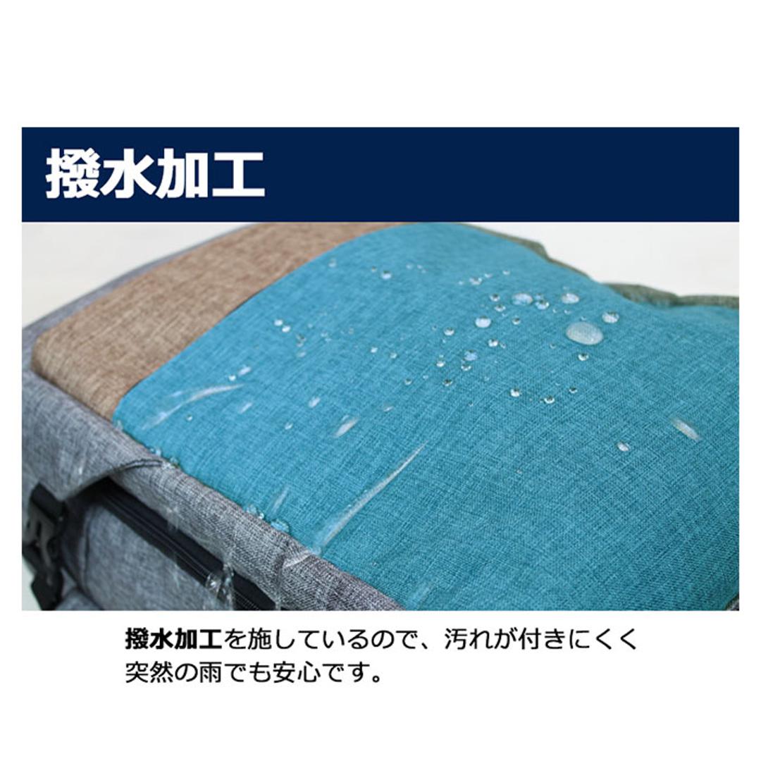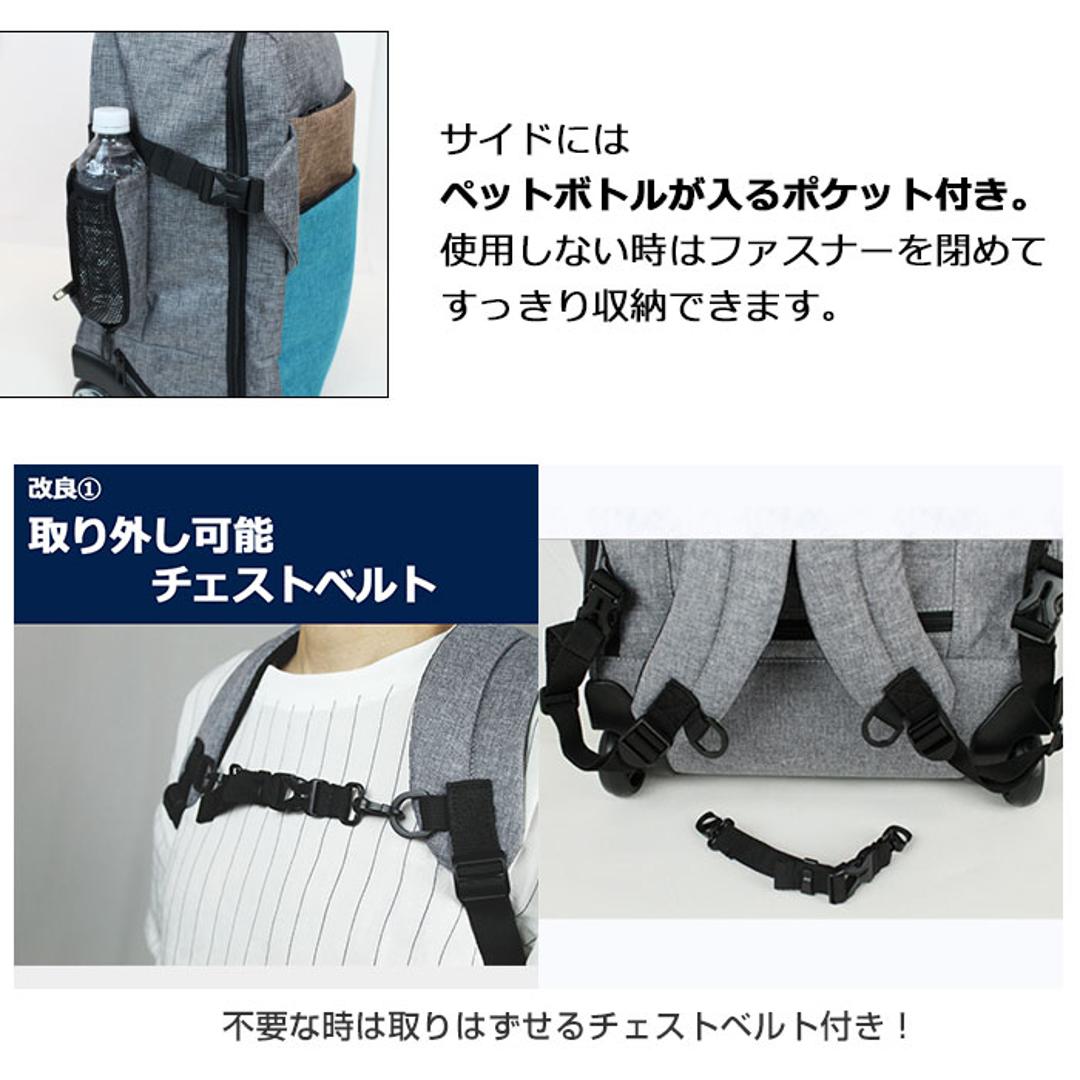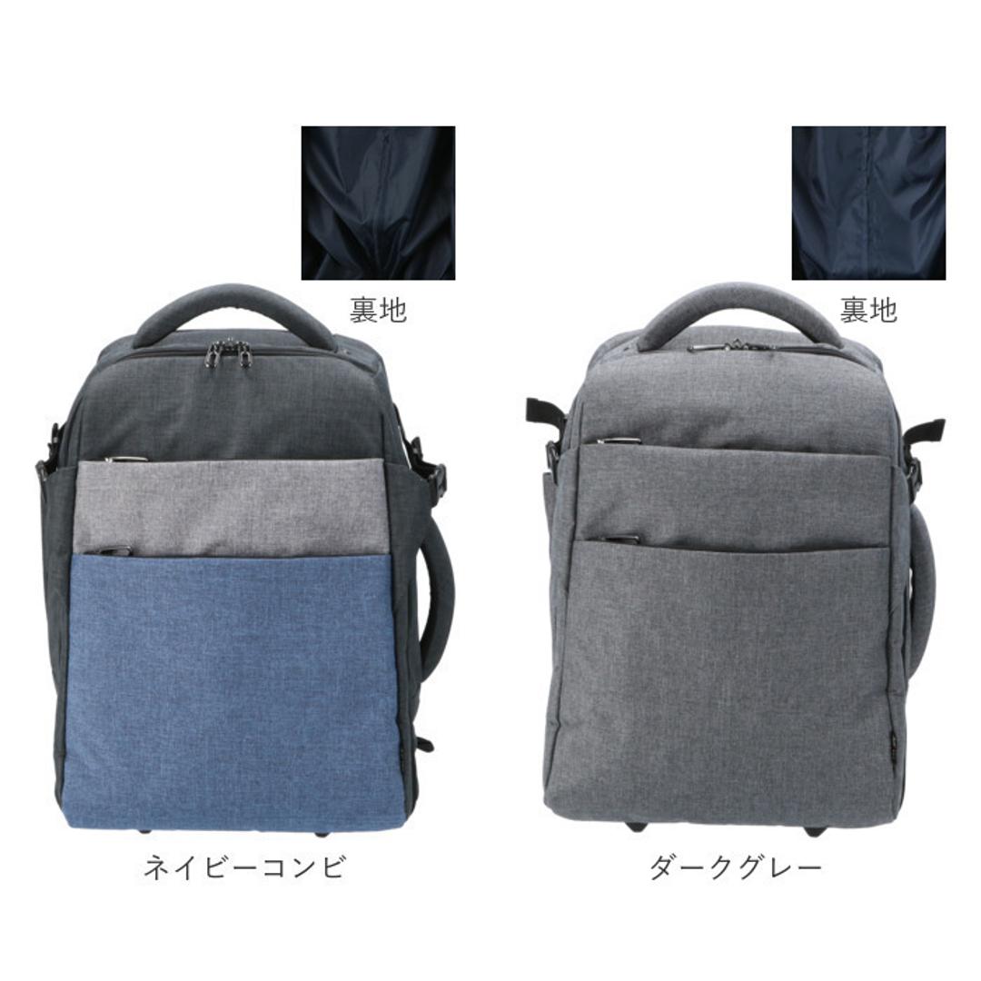 | 商品説明 | ・キャリーケースだけど、カチッとしすぎないデザイン!素材感のあるポリエステルキャンバス生地した、カジュアルなリュック&キャリー。 ・キャリーケースとしてだけでなく、背面からショルダーベルトを引き出し、リュックとしても使用できる2WAY仕様。本体にポリエステルキャンバス生地を使用することで、ハードケースタイプのキャリーケースより軽量で、リュックとしても使いやすい♪ ・フロントに、深さの違うファスナーポケットを2重に配置したユニークなデザイン。ポケットの生地色を切り替えたポップなカラーと、単一カラーのシンプルなデザインを選べるのも嬉しい。 ・上部ファスナーポケット内は、内ポケットが充実!スマートフォン用ポケット×1、オープンポケット×4、ペン挿し×2で、散らかりがちな小物もすっきり整理して収納できる。 ・メイン収納開口部はダブルファスナー式。スーツケースのようにラウンド型に側面下部まで大きく開くので、衣類や小物の出し入れがラクラク。小旅行やアウトドア用として、2泊3日程度の衣類やポーチが収まる大容量なのが嬉しい。 ・メイン収納内部には、ノートPCやタブレット端末が収納できるポケット付き。クッション性のある生地で、大切なモバイル端末の持ち運びも安心。 ・外側サイドには、500mlペットボトルを収納できるメッシュポケット付き。使わないときにはファスナーを閉めてたたみこめば見た目もすっきり。さらに反対側サイドには小物が収納できる独立型ファスナーポケットも。 ・ショルダーベルトは緩やかな曲線を描くS字状で、身体にフィットして方に負担がかかりにくい造り。リュックとして使わないときはファスナーの中にベルトをすっきりと収納可能! ・側面のバックル式調整ベルトでマチの大きさを調整可能。荷物が少なめの時はスマートなシルエットで使用できる。 ・リュック背面側に、キャリーケースのバーに通して使用できるベルト付き。ハードケースタイプのキャリーケースと併用して、旅行用のサブリュックにも使いやすい。 ・柔らかなグリップ感の持ち手は、上部と側面の2か所にあり、手持ちにしやすい。また、キャリーケースのバーはファスナー内に収納できるので、リュックとして使用するときも邪魔にならない。 ・キャリーケースを室内置きするときや、リュックとして背負う時に便利なキャスターカバー付き。キャスター上部のファスナーからカバーを引き出し、車輪をすっぽりとカバーできる。 |