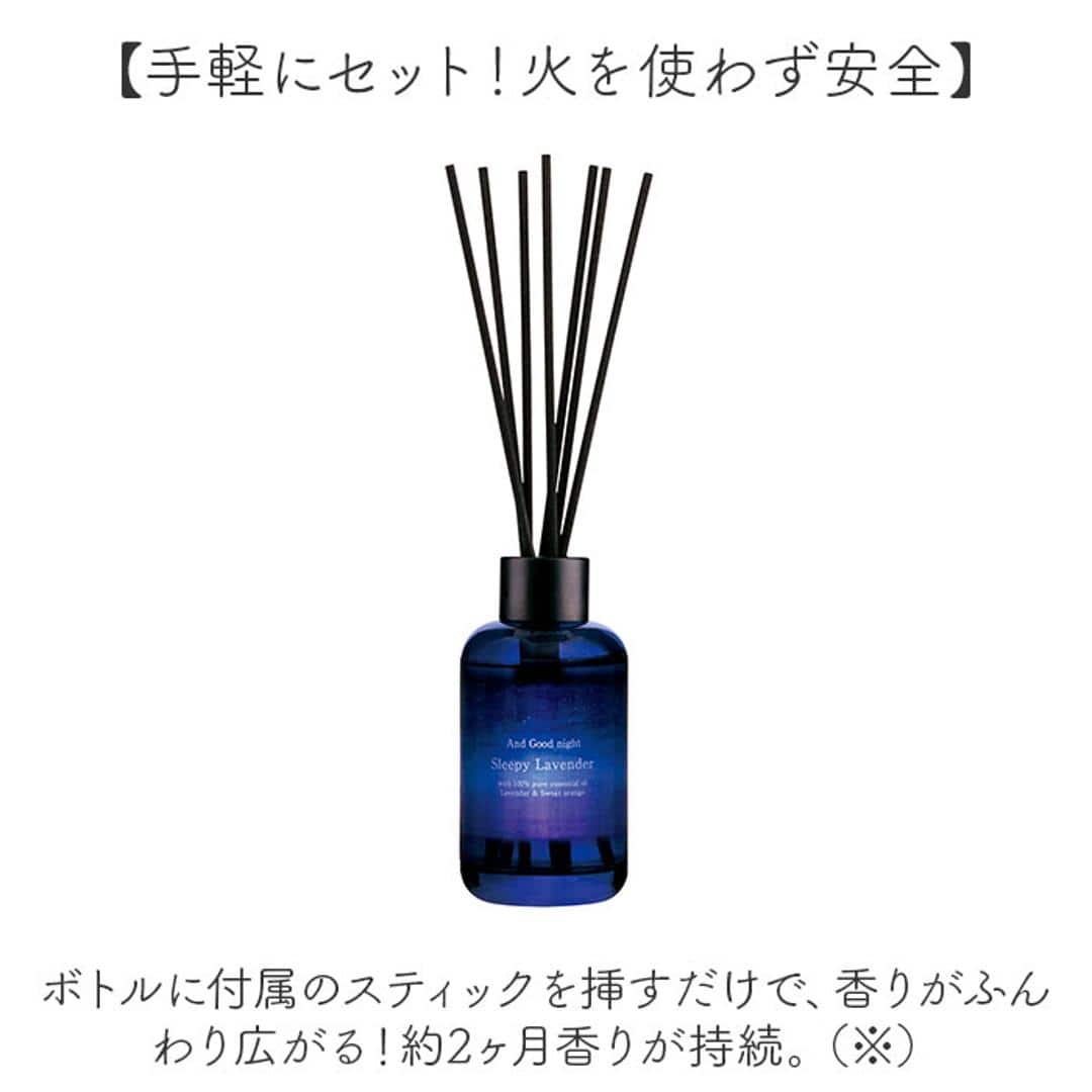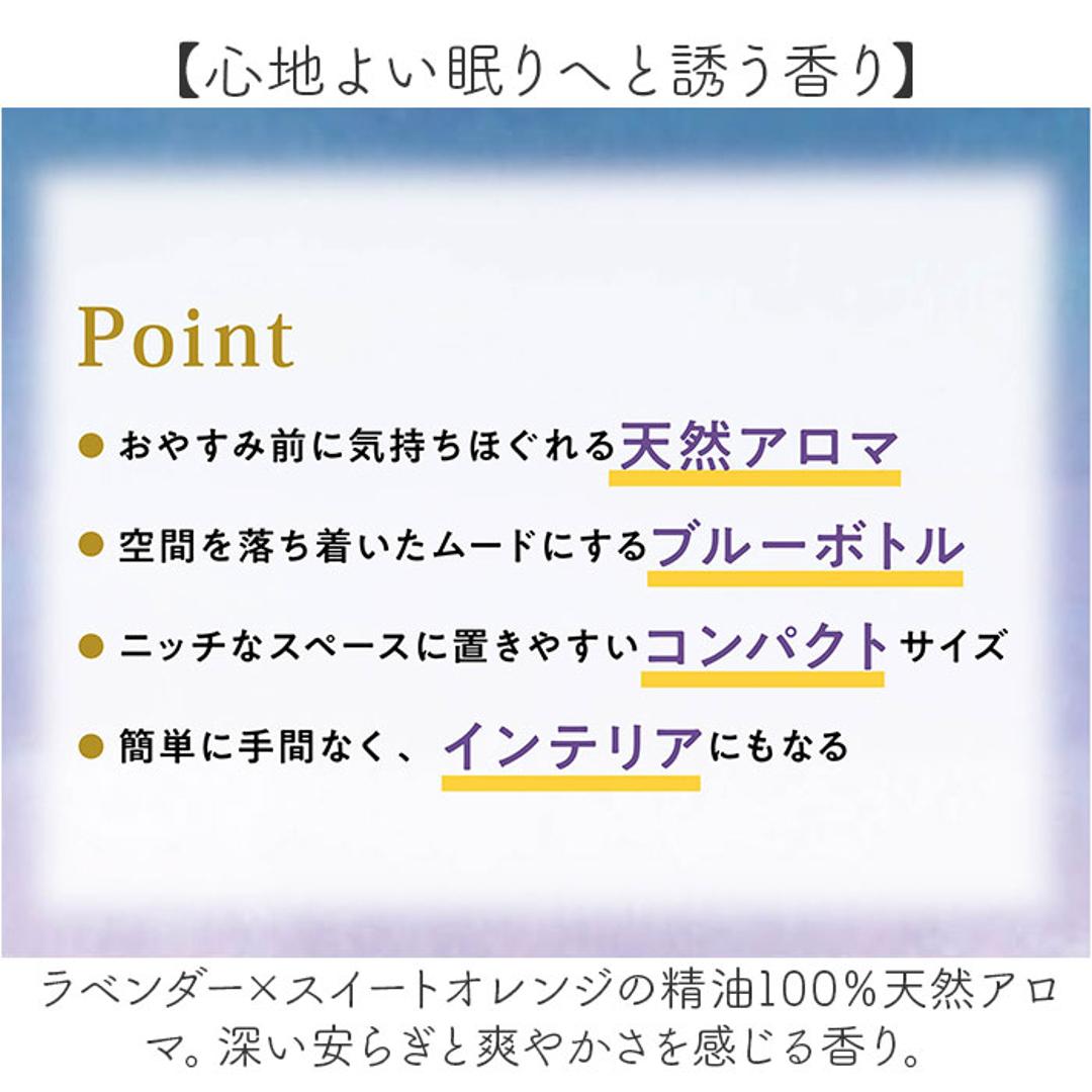 | 商品説明 | 【心地よい香りと共におやすみなさい】 ・気持ちほぐれる天然アロマ♪「AndGoodNight やすらぎアロマディフューザー」。 【おやすみ準備は空間づくりも大切に】 ・視覚からリラックス♪深みのあるブルーボトル。落ち着きのあるムードを演出。 【心地よい眠りへと誘う香り】 ・ラベンダー×スイートオレンジの精油100%天然アロマ。深い安らぎと爽やかさを感じる香り。 【手軽にセット!火を使わず安全】 ・ボトルに付属のスティックを挿すだけで、香りがふんわり広がる!約2ヶ月香りが持続。 (※)芳香期間は、使用環境によって異なります。 【コンパクトで置く場所を選ばない◎】 ・ニッチなスペースに置けるサイズ感。ベッドサイドテーブルなどに置いて寝室をおやすみ空間に。 【頑張っている人へのご褒美に】 ・アクティブモードからくつろぎモードへ。自分用にはもちろん、大切な方へ香りのギフトを。 |