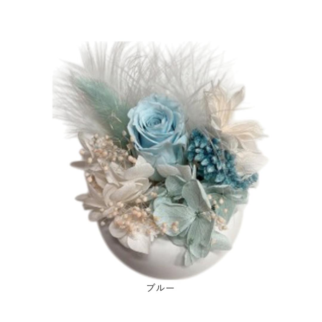 ・丸みのあるホワイトカラーのポット。羽をデザインした、カラフルなプリザーブドフラワー♪