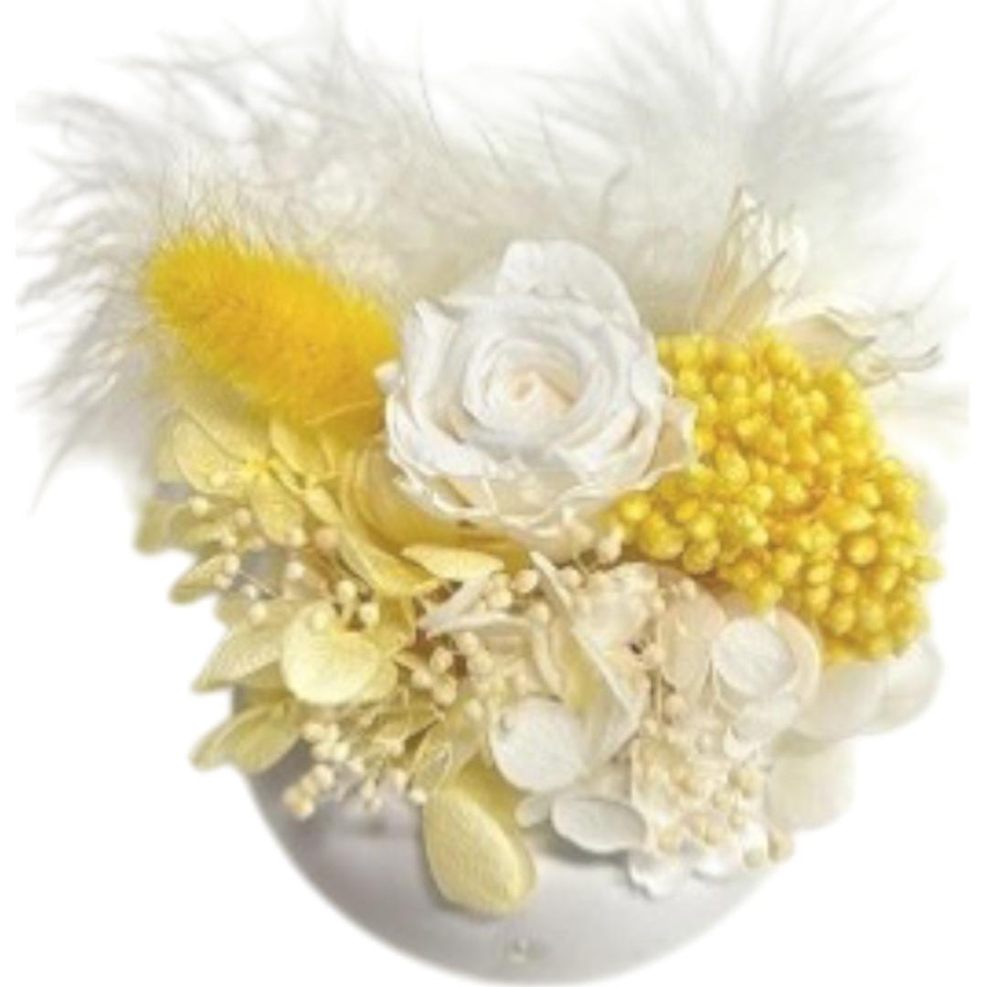 ・丸みのあるホワイトカラーのポット。羽をデザインした、カラフルなプリザーブドフラワー♪