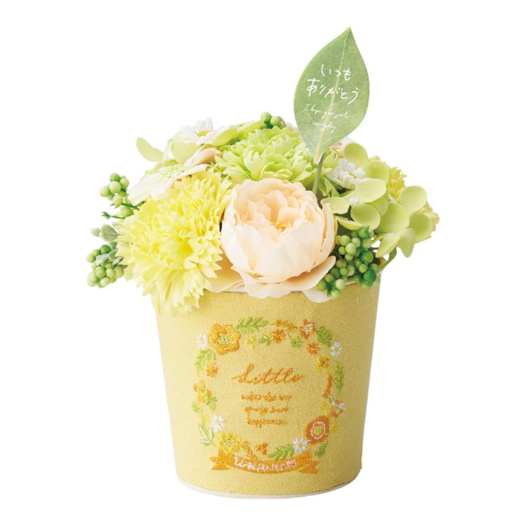 ・繊細な刺繍デザインを施したブリキポット&色とりどりのアーティフィシャルフラワーがマッチ♪