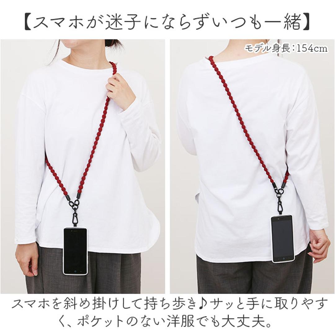 ・サイズ調節不要、引っ張るだけで紐全体が伸びる!体を寄せることなく、スマホを自由に使用。