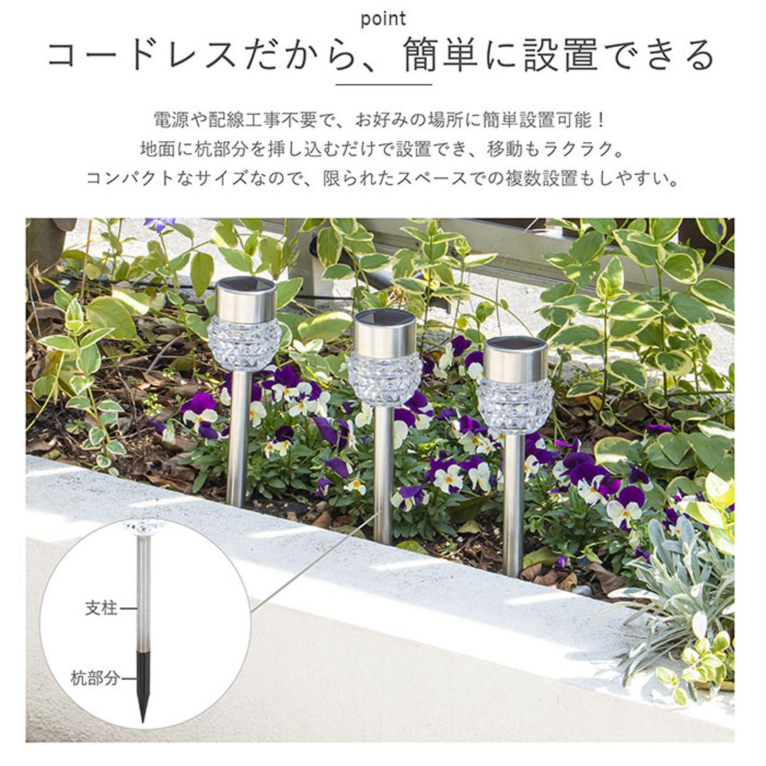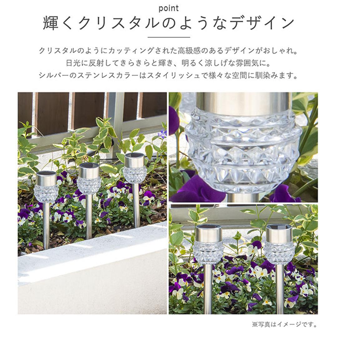 | 商品説明 | ・ガラスをカットしたような光がスタイリッシュな「クリスタルソーラーライト」が発売。 【ソーラー充電式】 ・上部のソーラーパネルに太陽光を当てるだけ!電気代0円でとってもエコ◎ 【やさしい灯り】 ・フル充電時で約6~8時間自動点灯。足元をやさしい灯りで照らしてくれる。 【自動点灯】 ・光センサーを搭載しているので、明るい日中は自動充電。夜間は自動点灯。スイッチのON/OFF操作が不要! 【簡単設置】 ・明るくしたい場所にポールを差し込むだけで簡単に設置可能。 【様々な場所で活躍】 ・庭や玄関先のアプローチライトとしてはもちろん、お店の入り口のライトアップにもピッタリ。 【おしゃれなデザインとカラー】 ・透明感のあるクリスタルデザインとシルバーの組み合わせが和・洋どちらの庭にも馴染む。 |