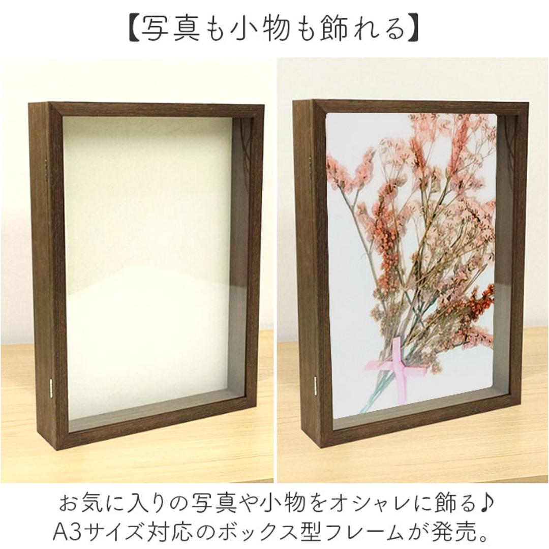 | 商品説明 | 【写真も小物も飾れる】 ・お気に入りの写真や小物をオシャレに飾る♪A3サイズ対応のボックス型フレームが発売。 【小物も収納できるボックス型】 ・奥行きが約7cm程あるので写真と一緒に思い出の品と一緒に飾り付けるのもおススメ。 【ピン留めができる背面】 ・写真や小物をピンで固定しやすいクッション入りの背面。コットンリネンでナチュラルさも◎ 【自由に飾り付け】 ・仕切りがないフリースペースで自由自在に写真の飾り付けやデコレーションが可能! 【観賞用のボックスとして】 ・高さ約42cm、横約40cmまでの小物に対応。ドールやドライフラワーの観賞&保管用にも 【シンプルな木目調デザイン】 ・フレームはシンプルな木目調デザインで主張しすぎず、どんなインテリアにも馴染む♪ 【出し入れ楽ちん】 ・フロントオープンで出し入れ作業がラクラク♪マグネット式で開閉もスムーズに可能。 【壁掛けも】 ・直置きはもちろん、フレーム裏にループが付いており、壁にかけて飾れる作りに。 【ウェルカムボードにも】 ・カリグラフィーカードを入れてウェディングやお店のウェルカムボードにもピッタリなアイテム |